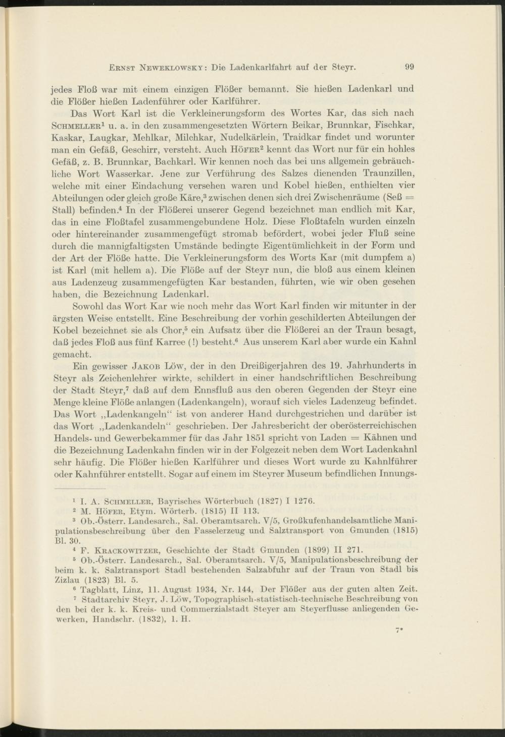 Ein gewisser Jakob Löw, der in den Dreißigerjahren des 19. Jahrhunderts in Steyr als Zeichenlehrer wirkte, schildert in einer handschriftlichen Beschreibung der Stadt Steyr, 7 daß auf dem Ennsfluß aus den oberen Gegenden der Steyr eine Menge kleine Flöße anlangen (Ladenkangeln), worauf sich vieles Ladenzeug befindet. Das Wort „Ladenkangeln“ ist von anderer Hand durchgestrichen und darüber ist das Wort „Ladenkandeln“ geschrieben. Der Jahresbericht der oberösterreichischen Handels- und Gewerbekammer für das Jahr 1851 spricht von Laden = Kähnen und die Bezeichnung Ladenkahn finden wir in der Folgezeit neben dem Wort Ladenkahnl sehr häufig. Die Flößer hießen Karlführer und dieses Wort wurde zu Kahnlführer oder Kahnführer entstellt. Sogar auf einem im Steyrer Museum befindlichen Innungs-