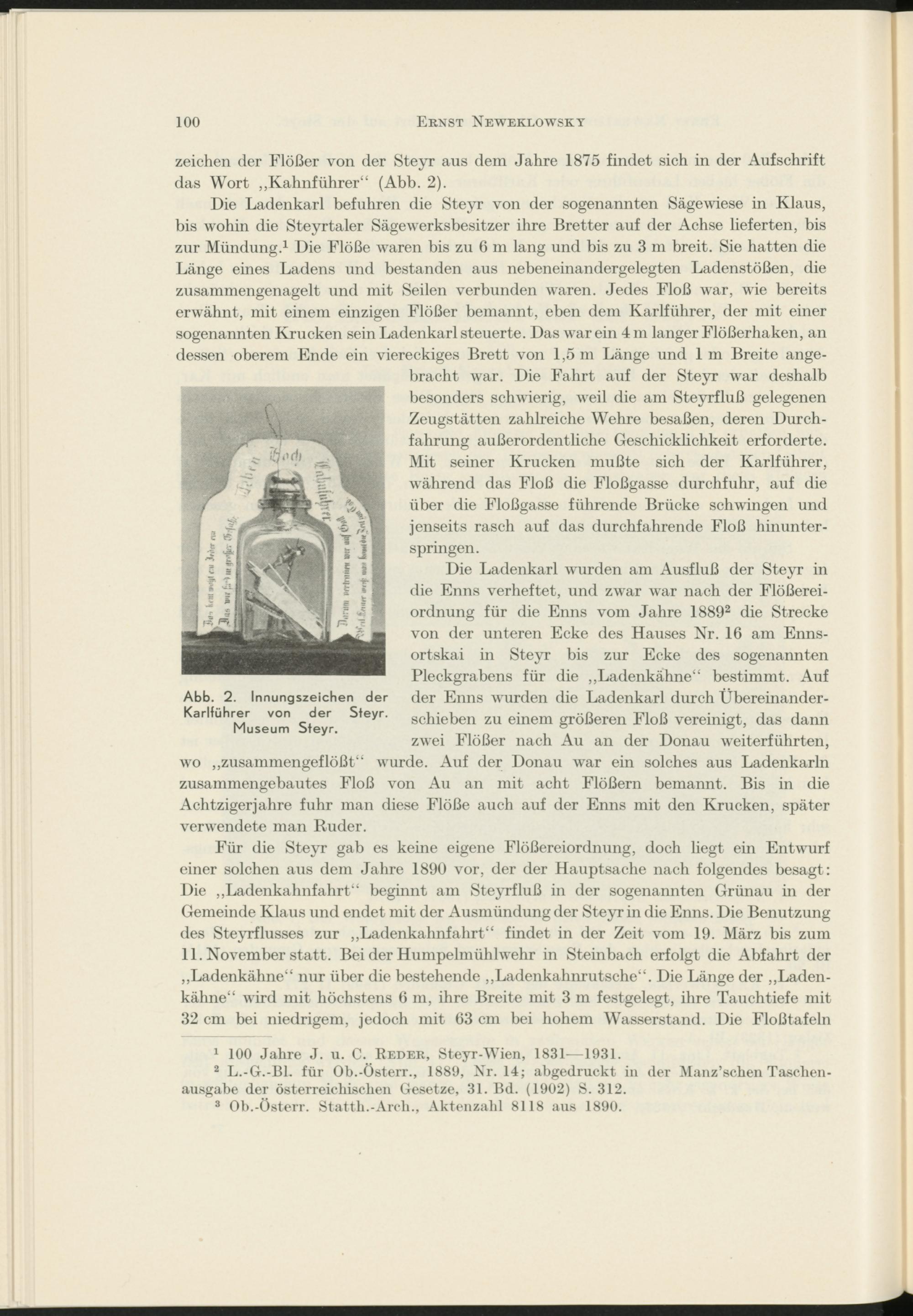 Die Ladenkarl befuhren die Steyr von der sogenannten Sägewiese in Klaus, bis wohin die Steyrtaler Sägewerksbesitzer ihre Bretter auf der Achse lieferten, bis zur Mündung. 1 Die Flöße waren bis zu 6 m lang und bis zu 3 m breit. Sie hatten die Länge eines Ladens und bestanden aus nebeneinandergelegten Ladenstößen, die zusammengenagelt und mit Seilen verbunden waren. Jedes Floß war, wie bereits erwähnt, mit einem einzigen Flößer bemannt, eben dem Karlführer, (1er mit einer sogenannten Krücken sein Ladenkarl steuerte. Das war ein 4 m langer Flößerhaken, an dessen oberem Ende ein viereckiges Brett von 1,5 m Länge und 1 m Breite angebracht war. Die Fahrt auf der Steyr war deshalb besonders schwierig, weil die am Steyrfluß gelegenen Zeugstätten zahlreiche Wehre besaßen, deren Durchfahrung außerordentliche Geschicklichkeit erforderte. Mit seiner Krücken mußte sich der Karlführer, während das Floß die Floßgasse durchfuhr, auf die über die Floßgasse führende Brücke schwingen und jenseits rasch auf das durchfahrende Floß hinunterspringen.
