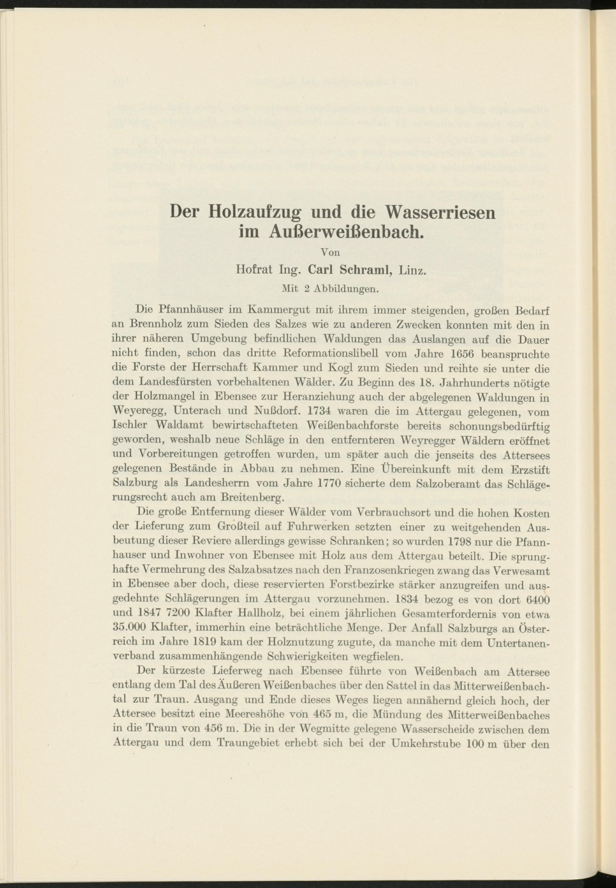 Der kürzeste Lieferweg nach Ebensee führte von Weißenbach am Attersee entlang dem Tal des Äußeren Weißen badies über den Sattel in das Mitterweißenbach- tal zur Traun. Ausgang und Ende dieses Weges hegen annähernd gleich hoch, der Attersee besitzt eine Meereshöhe von 465 m, die Mündung des Mitterweißenbaches in die Traun von 456 m. Die in der Wegmitte gelegene Wasserscheide zwischen dem Attergau und dem Traungebiet erhebt sich bei der Umkehrstube 100 m über den