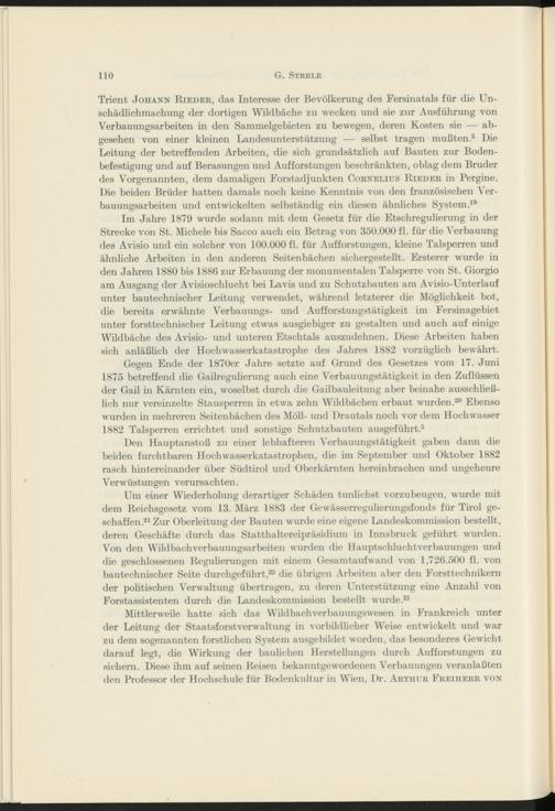 Trient Johann Rieder, das Interesse der Bevölkerung des Fersinatals für die Unschädlichmachung der dortigen Wildbäche zu wecken und sie zur Ausführung von Verbauungsarbeiten in den Sammelgebieten zu bewegen, deren Kosten sie — abgesehen von einer kleinen Landesunterstützung — selbst tragen mußten. 5 Die Leitung der betreffenden Arbeiten, die sich grundsätzlich auf Bauten zur Bodenbefestigung und auf Berasungen und Aufforstungen beschränkten, oblag dem Bruder des Vorgenannten, dem damaligen Forstadjunkten Cornelius Rieder in Pergine. Die beiden Brüder hatten damals noch keine Kenntnis von den französischen Verbauungsarbeiten und entwickelten selbständig ein diesen ähnliches System. 19