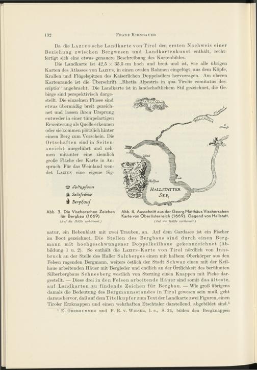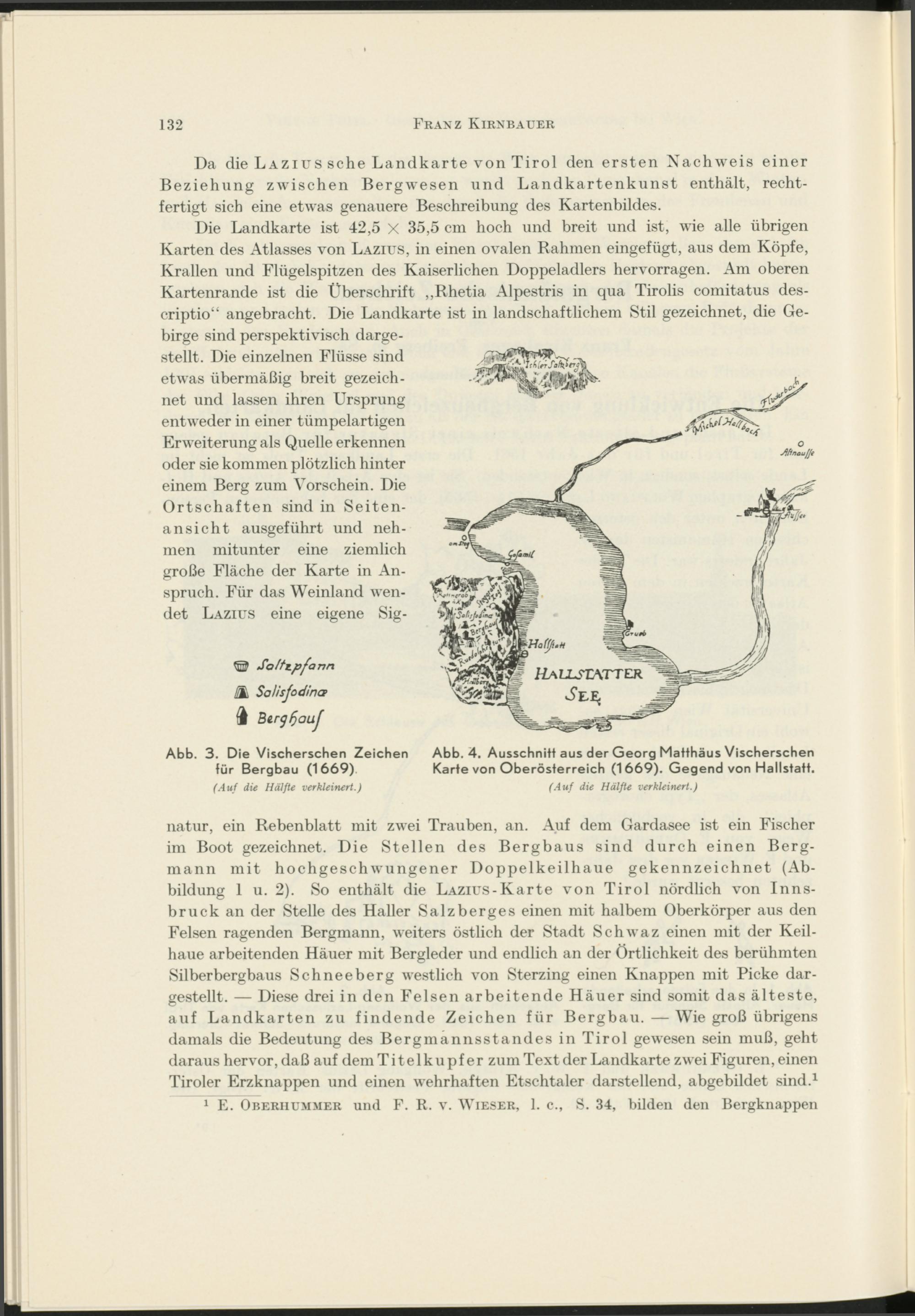 natur, ein Rebenblatt mit zwei Trauben, an. Auf dem Gardasee ist ein Fischer im Boot gezeichnet. Die Stellen des Bergbaus sind durch einen Bergmann mit hochgeschwungener Doppelkeilhaue gekennzeichnet (Abbildung 1 u. 2). So enthält die LAZius-Karte von Tirol nördlich von Innsbruck an der Stelle des Haller Salzberges einen mit halbem Oberkörper aus den Felsen ragenden Bergmann, weiters östlich der Stadt Schwaz einen mit der Keilhaue arbeitenden Häuer mit Bergleder und endlich an der Örtlichkeit des berühmten Silberbergbaus Schneeberg westlich von Sterzing einen Knappen mit Picke dargestellt. — Diese drei in den Felsen arbeitende Häuer sind somit das älteste, auf Landkarten zu findende Zeichen für Bergbau. — Wie groß übrigens damals die Bedeutung des Bergmannsstandes in Tirol gewesen sein muß, geht daraus hervor, daß auf dem Titelkupfer zum Text der Landkarte zwei Figuren, einen Tiroler Erzknappen und einen wehrhaften Etschtaler darstellend, abgebildet sind. 1