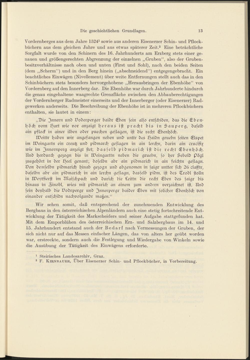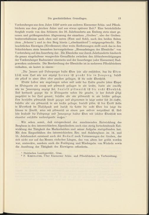 Vordernberges aus dem Jahre 1524 1 sowie aus anderen Eisenerzer Schin- und Pflockbüchern aus dem gleichen Jahre und aus etwas späterer Zeit. 2 Eine beträchtliche Sorgfalt wurde von den Schinern des 16. Jahrhunderts am Erzberg stets einer genauen und größengerechten Abgrenzung der einzelnen „Gruben“, also der Grubenbesitzverhältnisse nach oben und unten (First und Sohl), nach den beiden Seiten (dem „Seherin“) und in den Berg hinein („abschneidend“) entgegengebracHt. Ein beachtliches Einwägen (Nivellement) über weite Entfernungen stellt auch das in den Schinbüchern stets besonders hervorgehobene „Herausbringen der Ebenhöhe“ von Vordernberg auf den Innerberg dar. Die Ebenhöhe war durch Jahrhunderte hindurch die genau eingehaltene waagrechte Grenzfläche zwischen den Abbauberechtigungen der Vordernberger Radmeister einerseits und der Innerberger (oder Eisenerzer) Radgewerken anderseits. Die Beschreibung der Ebenhöhe ist in mehreren Pflockbüchern enthalten, sie lautet in einem: