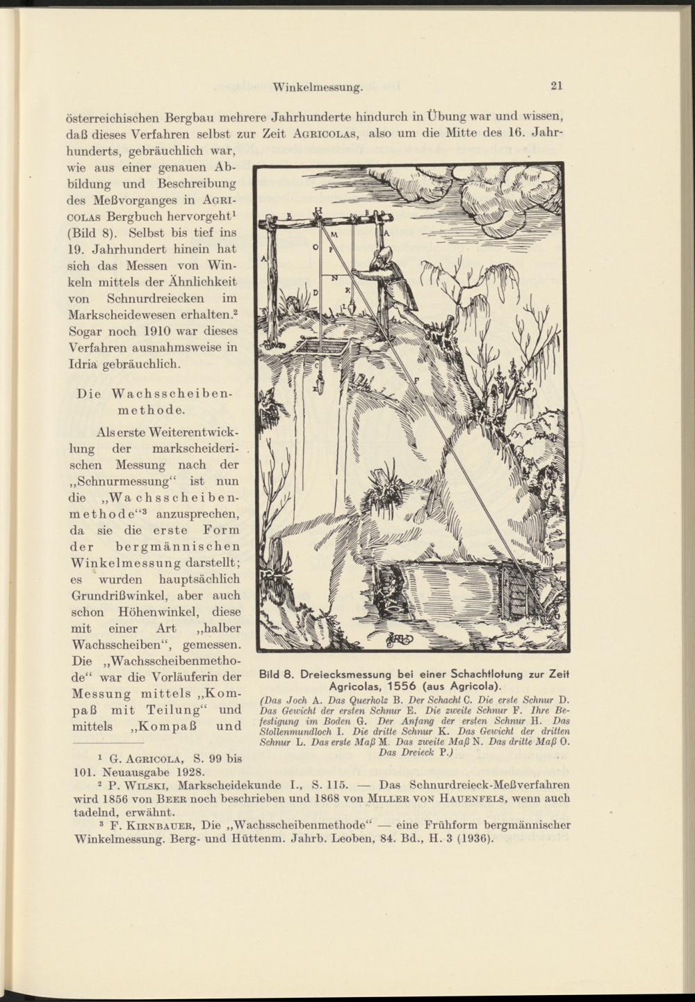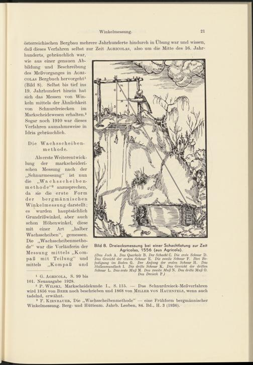 wie aus einer genauen Ab- ^^l iu bildung und Beschreibung des Meßvorganges in Agricolas Bergbuch hervorgeht 1 (Bild 8). Selbst bis tief ins 19. Jahrhundert hinein hat sich das Messen von Winkeln mittels der Ähnlichkeit von Schnurdreiecken im Markscheidewesen erhalten. 2 Sogar noch 1910 war dieses Verfahren ausnahmsweise in Idria gebräuchlich.