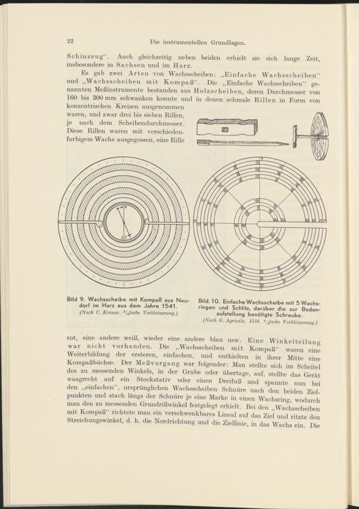 rot, eine andere weiß, wieder eine andere blau usw. Eine Winkelteilung war nicht vorhanden. Die „Wachsscheiben mit Kompaß“ waren eine Weiterbildung der ersteren, einfachen, und enthielten in ihrer Mitte eine Kompaßbüchse. Der Meßvorgang war folgender: Man stellte sich im Scheitel des zu messenden Winkels, in der Grube oder übertage, auf, stellte das Gerät waagrecht auf ein Stockstativ oder einen Dreifuß und spannte nun bei den „einfachen“, ursprünglichen Wachsscheiben Schnüre nach den beiden Zielpunkten und stach längs der Schnüre je eine Marke in einen Wachsring, wodurch man den zu messenden Grundrißwinkel festgelegt erhielt. Bei den „Wachsscheiben mit Kompaß“ richtete man ein verschwenkbares Lineal auf das Ziel und ritzte den Streichungswinkel, d. h. die Nordrichtung und die Ziellinie, in das Wachs ein. Die