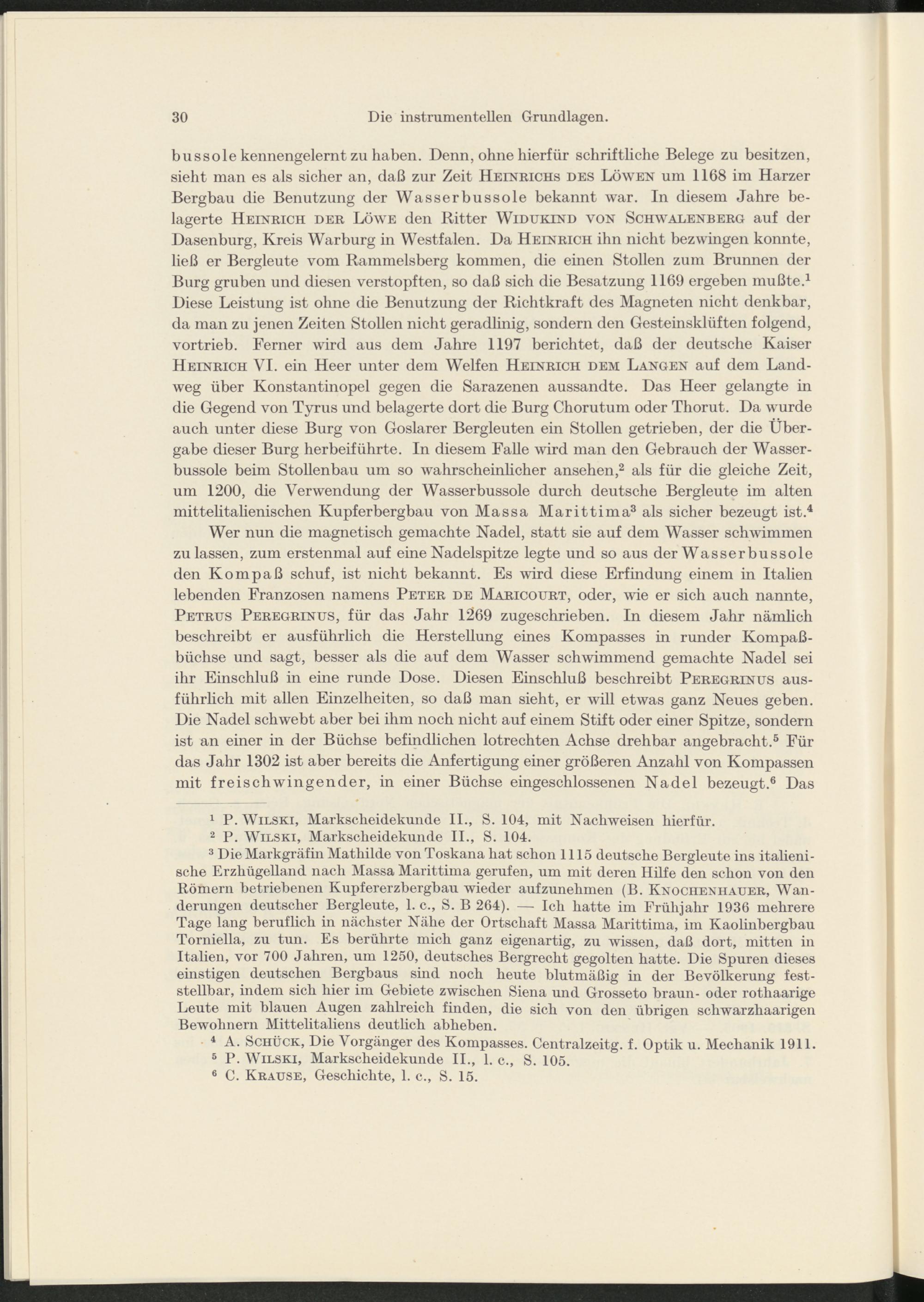 bussole kennengelernt zu haben. Denn, ohne hierfür schriftliche Belege zu besitzen, sieht man es als sicher an, daß zur Zeit Heinrichs des Löwen um 1168 im Harzer Bergbau die Benutzung der Wasserbussole bekannt war. In diesem Jahre belagerte Heinrich der Löwe den Ritter Widukind von Schwalenberg auf der Dasenburg, Kreis Warburg in Westfalen. Da Heinrich ihn nicht bezwingen konnte, ließ er Bergleute vom Rammeisberg kommen, die einen Stollen zum Brunnen der Burg gruben und diesen verstopften, so daß sich die Besatzung 1169 ergeben mußte. 1 Diese Leistung ist ohne die Benutzung der Richtkraft des Magneten nicht denkbar, da man zu jenen Zeiten Stollen nicht geradlinig, sondern den Gesteinsklüften folgend, vortrieb. Ferner wird aus dem Jahre 1197 berichtet, daß der deutsche Kaiser Heinrich VI. ein Heer unter dem Welfen Heinrich dem Langen auf dem Landweg über Konstantinopel gegen die Sarazenen aussandte. Das Heer gelangte in die Gegend von Tyrus und belagerte dort die Burg Chorutum oder Thorut. Da wurde auch unter diese Burg von Goslarer Bergleuten ein Stollen getrieben, der die Übergabe dieser Burg herbeiführte. In diesem Falle wird man den Gebrauch der Wasserbussole beim Stollenbau um so wahrscheinlicher ansehen, 2 als für die gleiche Zeit, um 1200, die Verwendung der Wasserbussole durch deutsche Bergleute im alten mittelitalienischen Kupferbergbau von Massa Marittima 3 als sicher bezeugt ist. 4