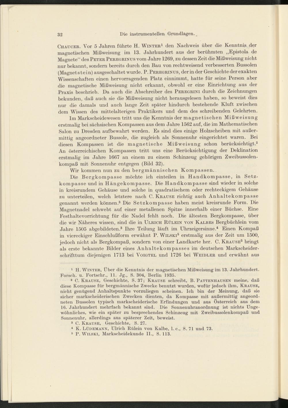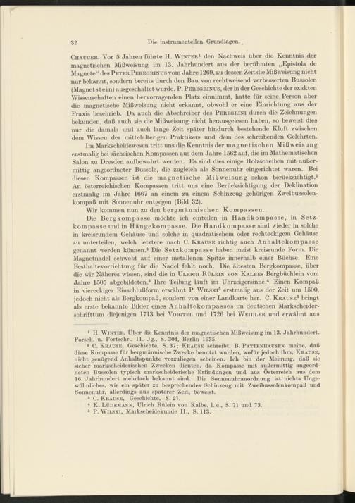 Chaucer. Vor 5 Jahren führte H. Winter 1 den Nachweis über die Kenntnis der magnetischen Mißweisung im 13. Jahrhundert aus der berühmten „Epistola de Magnete“ des Peter Peregrinus vom Jahre 1269, zu dessen Zeit die Mißweisung nicht nur bekannt, sondern bereits durch den Bau von rechtweisend verbesserten Bussolen (Magnetstein) ausgeschaltet wurde. P. Peregrinus, der in der Geschichte der exakten Wissenschaften einen hervorragenden Platz einnimmt, hatte für seine Person aber die magnetische Mißweisung nicht erkannt, obwohl er eine Einrichtung aus der Praxis beschrieb. Da auch die Abschreiber des Peregrini durch die Zeichnungen bekunden, daß auch sie die Mißweisung nicht herausgelesen haben, so beweist dies nur die damals und auch lange Zeit später hindurch bestehende Kluft zwischen dem Wissen des mittelalterigen Praktikers und dem des schreibenden Gelehrten.