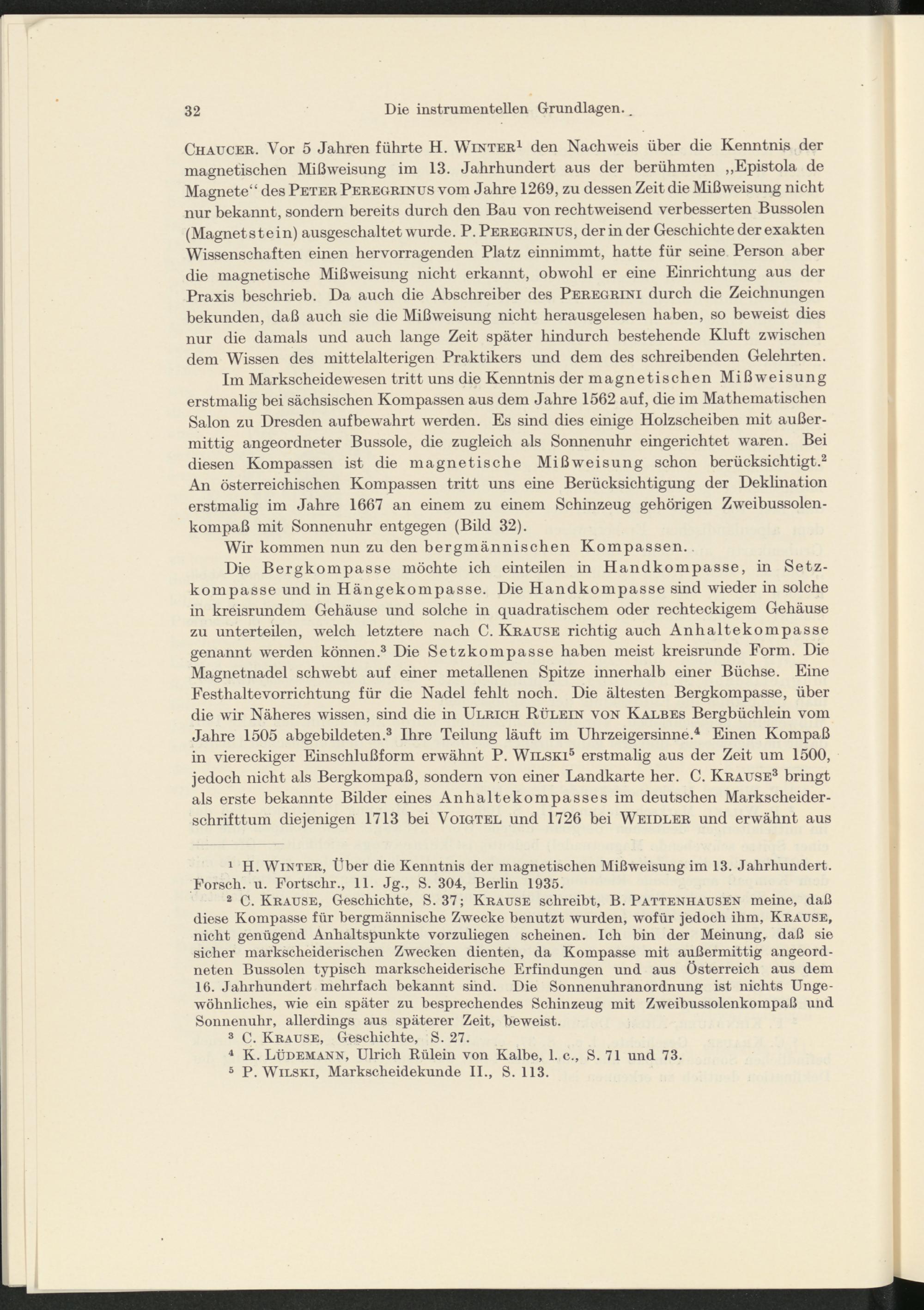 Im Markscheidewesen tritt uns die Kenntnis der magnetischen Mißweisung erstmalig bei sächsischen Kompassen aus dem Jahre 1562 auf, die im Mathematischen Salon zu Dresden auf bewahrt werden. Es sind dies einige Holzscheiben mit außermittig angeordneter Bussole, die zugleich als Sonnenuhr eingerichtet waren. Bei diesen Kompassen ist die magnetische Mißweisung schon berücksichtigt . 2 An österreichischen Kompassen tritt uns eine Berücksichtigung der Deklination erstmalig im Jahre 1667 an einem zu einem Schinzeug gehörigen Zweibussolenkompaß mit Sonnenuhr entgegen (Bild 32).