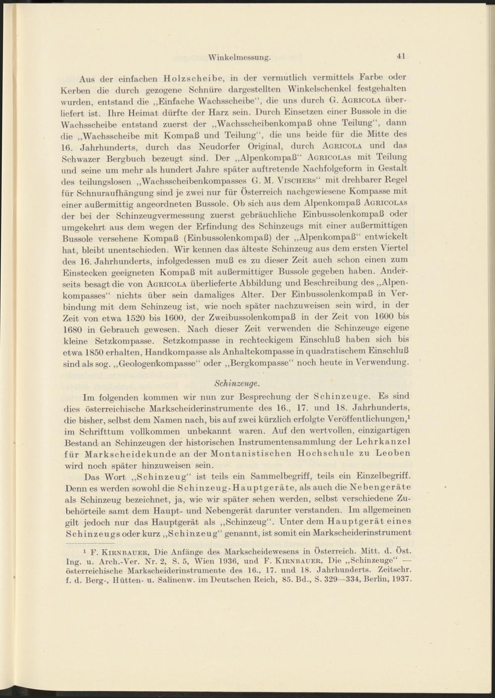 1 F. Kirnbauer, Die Anfänge des Markscheidewesens in Österreich. Mitt. d. Öst. Ing. u. Arch.-Ver. Nr. 2, S. 5, Wien 1936, und F. Kirnbauer, Die „Schinzeuge“ — österreichische Markscheiderinstrumente des 16., 17. und 18. Jahrhunderts. Zeitschr. f. d. Berg-, Hütten- u. Salinenw. im Deutschen Reich, 85. Bd., S. 329—334, Berlin, 1937.