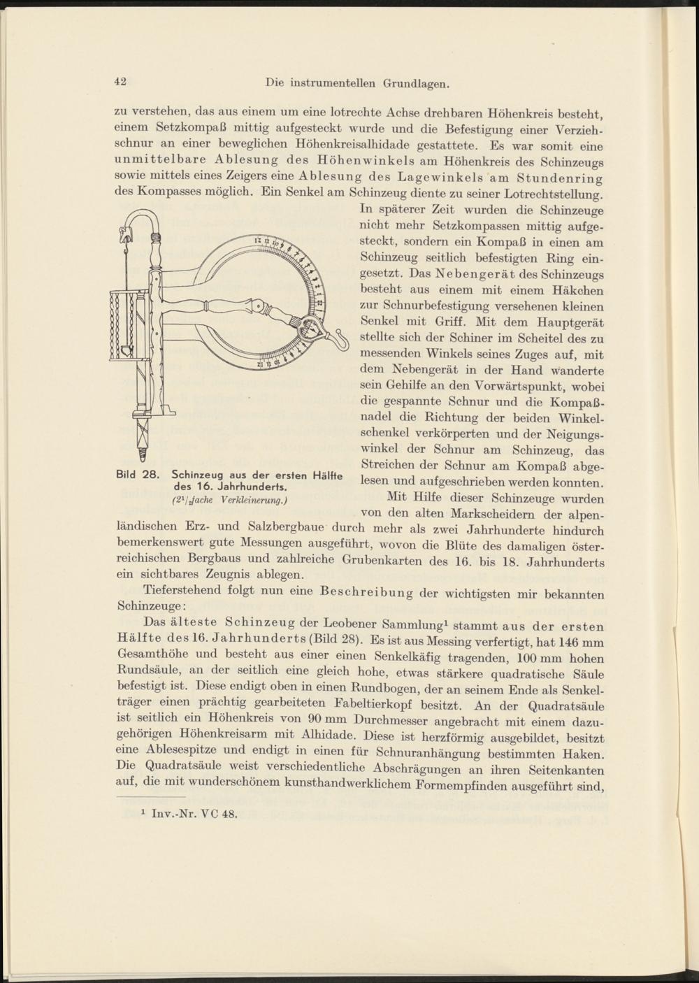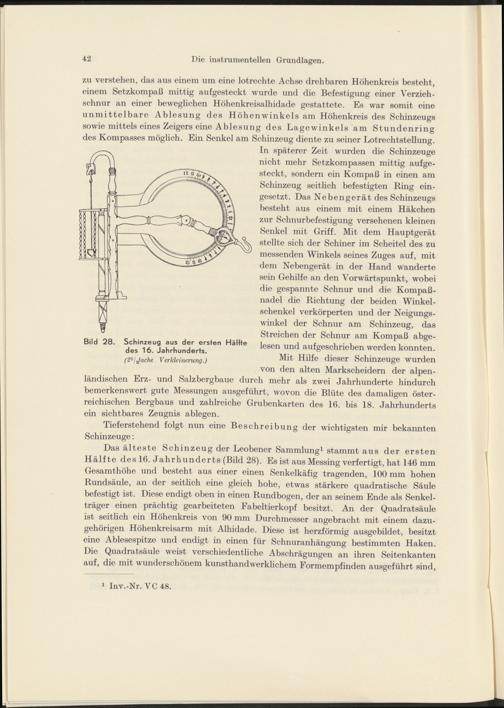 Das älteste Schinzeug der Leobener Sammlung 1 stammt aus der ersten Hälfte des 16. J ahrhunderts (Bild 28). Es ist aus Messing verfertigt, hat 146 mm Gesamthöhe und besteht aus einer einen Senkelkäfig tragenden, 100 mm hohen Rundsäule, an der seitlich eine gleich hohe, etwas stärkere quadratische Säule befestigt ist. Diese endigt oben in einen Rundbogen, der an seinem Ende als Senkelträger einen prächtig gearbeiteten Eabeltierkopf besitzt. An der Quadratsäule ist seitlich ein Höhenkreis von 90 mm Durchmesser angebracht mit einem dazugehörigen Höhenkreisarm mit Alhidade. Diese ist herzförmig ausgebildet, besitzt eine Ablesespitze und endigt in einen für Schnuranhängung bestimmten Haken. Die Quadratsäule weist verschiedentliche Abschrägungen an ihren Seitenkanten auf, die mit wunderschönem kunsthandwerklichem Formempfinden ausgeführt sind,