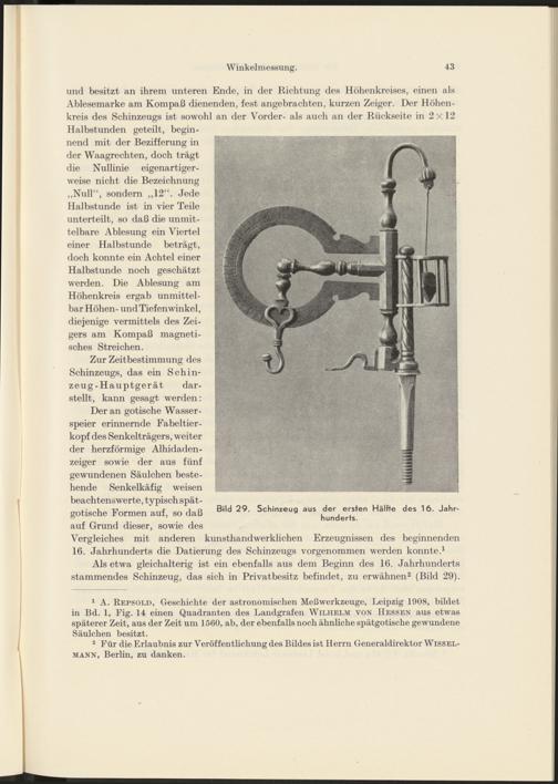 1 A. Repsold, Geschichte der astronomischen Meßwerkzeuge, Leipzig 1908, bildet in Bd. 1, Fig. 14 einen Quadranten des Landgrafen Wilhelm von Hessen aus etwas späterer Zeit, aus der Zeit um 1560, ab, der ebenfalls noch ähnliche spätgotische gewundene Säulchen besitzt.