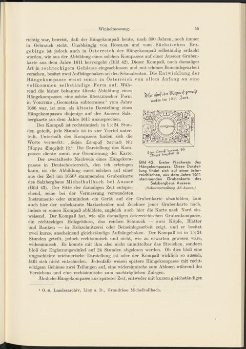richtig war, beweist, daß der Hängekompaß heute, nach 300 Jahren, noch immer in Gebrauch steht. Unabhängig von Rössler und vom Sächsischen Erzgebirge ist jedoch auch in Österreich der Hängekompaß selbständig erdacht worden, wie aus der Abbildung eines solchen Kompasses auf einer Ausseer Grubenkarte aus dem Jahre 1611 hervorgeht (Bild 42). Dieser Kompaß, nach damaliger Art in rechteckigem Gehäuse eingeschlossen und mit schöner Beineinlegearbeit versehen, besitzt zwei Aufhängehaken an den Schmalseiten. Die Entwicklung der Hängekompasse weist somit in Österreich von allem Anfang an eine vollkommen selbständige Form auf. Während die bisher bekannte älteste Abbildung eines Hängekompasses eine solche RössLERscher Form in V oigtels „Geometria subterranea“ vom Jahre 1686 war, ist nun als älteste Darstellung eines Hängekompasses diejenige auf der Ausseer Salzbergkarte aus dem Jahre 1611 anzusprechen.