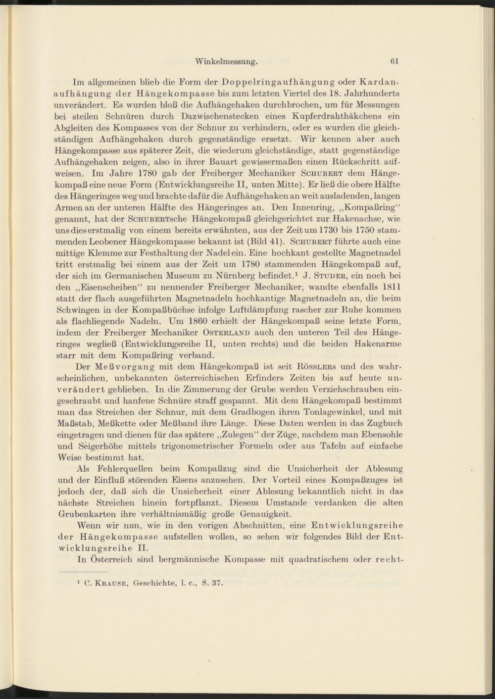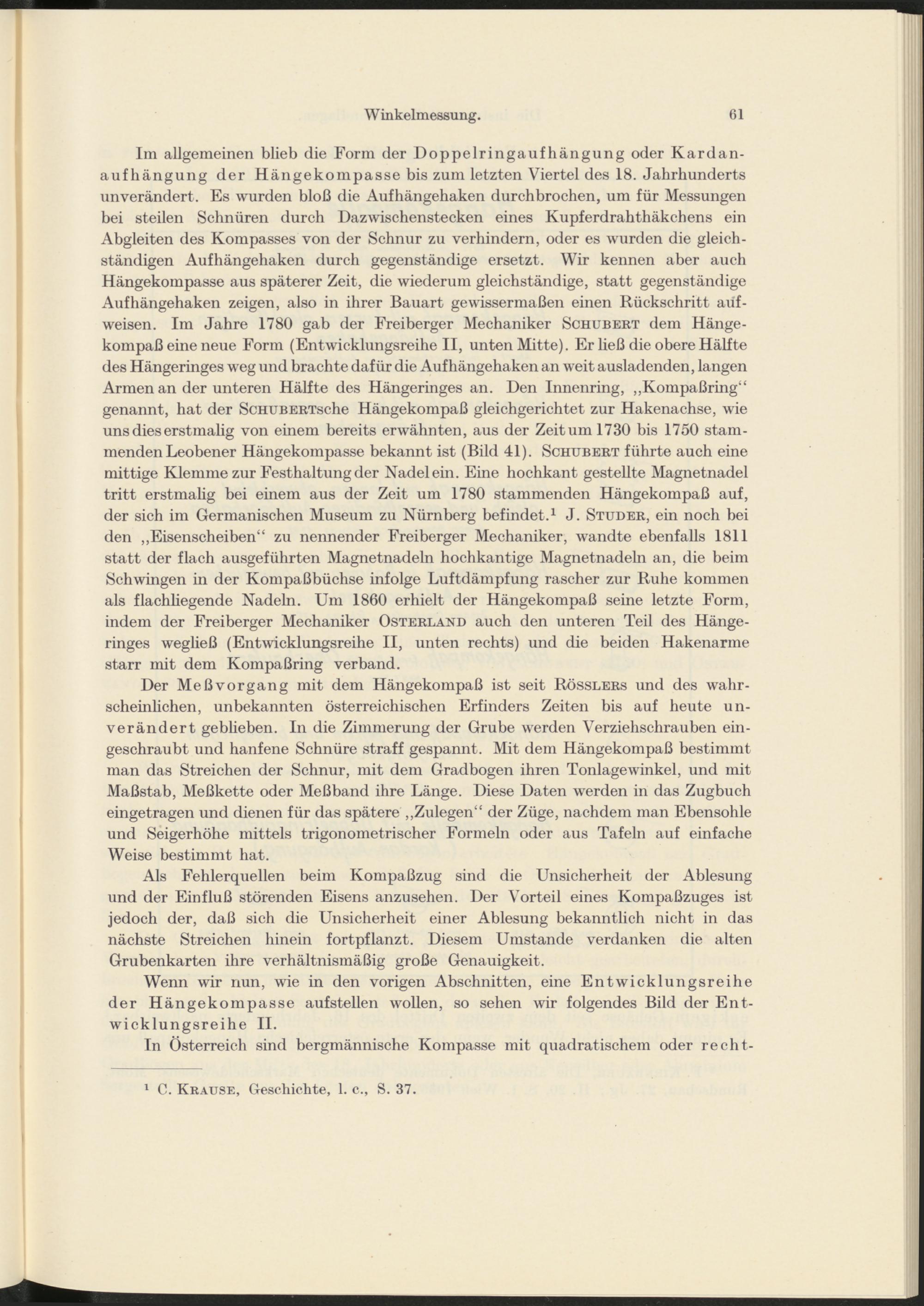 Im allgemeinen blieb die Form der Doppelringaufhängung oder Kardanaufhängung der Hängekompasse bis zum letzten Viertel des 18. Jahrhunderts unverändert. Es wurden bloß die Aufhängehaken durchbrochen, um für Messungen bei steilen Schnüren durch Dazwischenstecken eines Kupferdrahthäkchens ein Abgleiten des Kompasses von der Schnur zu verhindern, oder es wurden die gleichständigen Aufhängehaken durch gegenständige ersetzt. Wir kennen aber auch Hängekompasse aus späterer Zeit, die wiederum gleichständige, statt gegenständige Aufhängehaken zeigen, also in ihrer Bauart gewissermaßen einen Rückschritt auf- weisen. Im Jahre 1780 gab der Freiberger Mechaniker Schubert dem Hängekompaß eine neue Form (Entwicklungsreihe II, unten Mitte). Er ließ die obere Hälfte des Hängeringes weg und brachte dafür die Aufhängehaken an weit ausladenden, langen Armen an der unteren Hälfte des Hängeringes an. Den Innenring, „Kompaßring“ genannt, hat der ScHUBERTsche Hängekompaß gleichgerichtet zur Hakenachse, wie uns dies erstmalig von einem bereits erwähnten, aus der Zeit um 1730 bis 1750 stammenden Leobener Hängekompasse bekannt ist (Bild 41). Schubert führte auch eine mittige Klemme zur Festhaltung der Nadel ein. Eine hochkant gestellte Magnetnadel tritt erstmalig bei einem aus der Zeit um 1780 stammenden Hängekompaß auf, der sich im Germanischen Museum zu Nürnberg befindet. 1 J. Studer, ein noch bei den „Eisenscheiben“ zu nennender Freiberger Mechaniker, wandte ebenfalls 1811 statt der flach ausgeführten Magnetnadeln hochkantige Magnetnadeln an, die beim Schwingen in der Kompaßbüchse infolge Luftdämpfung rascher zur Ruhe kommen als flachliegende Nadeln. Um 1860 erhielt der Hängekompaß seine letzte Form, indem der Freiberger Mechaniker Osterland auch den unteren Teil des Hängeringes wegließ (Entwicklungsreihe II, unten rechts) und die beiden Hakenarme starr mit dem Kompaßring verband.