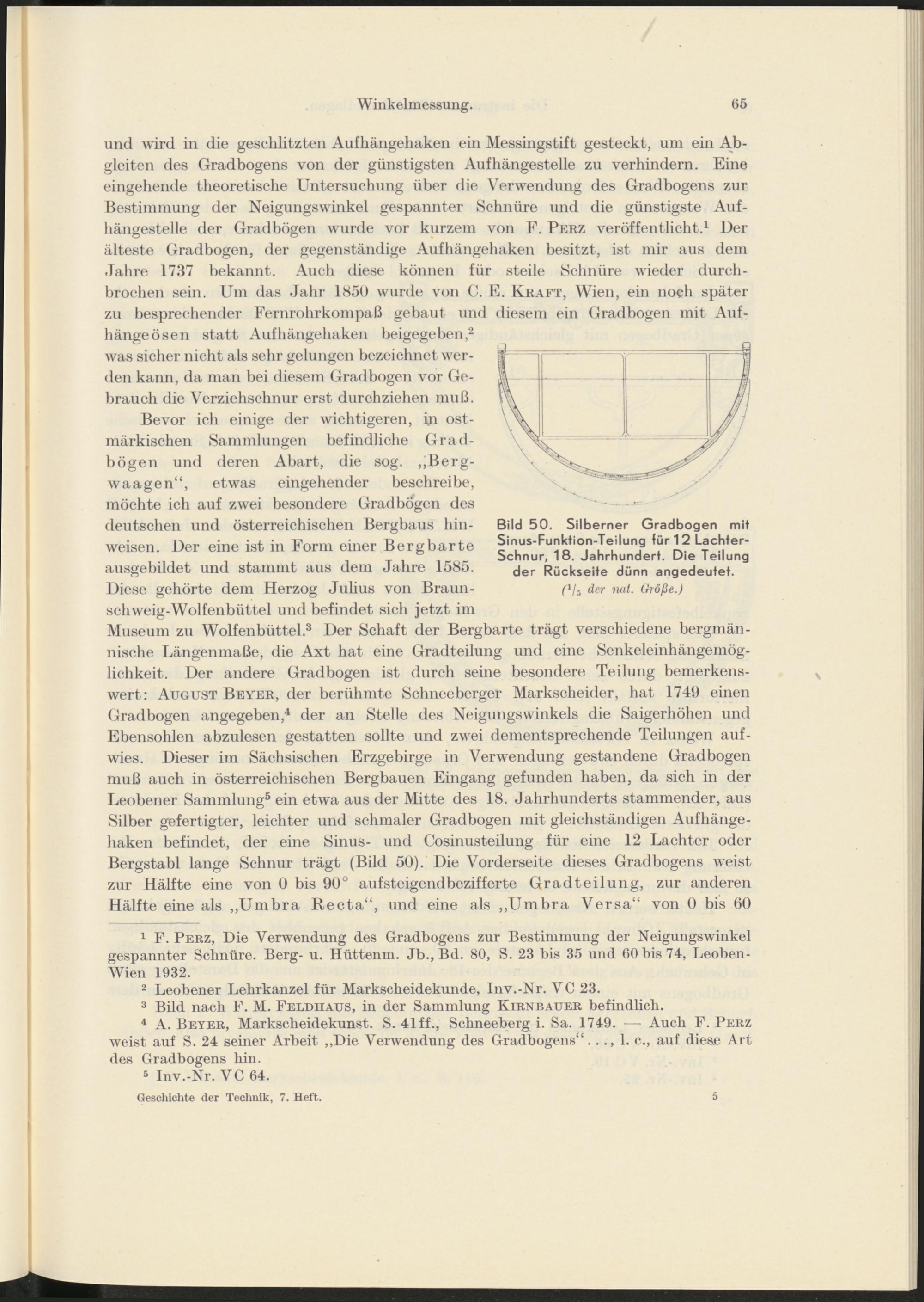 Diese gehörte dem Herzog Julius von Braun - schweig-Wolfenbüttel und befindet sich jetzt im Museum zu Wolfenbüttel. 3 Der Schaft der Bergbarte trägt verschiedene bergmännische Längenmaße, die Axt hat eine Gradteilung und eine Senkeleinhängemöglichkeit. Der andere Gradbogen ist durch seine besondere Teilung bemerkenswert: August Beyer, der berühmte Schneeberger Markscheider, hat 1749 einen Gradbogen angegeben, 4 der an Stelle des Neigungswinkels die Saigerhöhen und Ebensohlen abzulesen gestatten sollte und zwei dementsprechende Teilungen auf- wies. Dieser im Sächsischen Erzgebirge in Verwendung gestandene Gradbogen muß auch in österreichischen Bergbauen Eingang gefunden haben, da sich in der Leobener Sammlung 5 ein etwa aus der Mitte des 18. Jahrhunderts stammender, aus Silber gefertigter, leichter und schmaler Gradbogen mit gleichständigen Aufhängehaken befindet, der eine Sinus- und Cosinusteilung für eine 12 Lachter oder Bergstabl lange Schnur trägt (Bild 50). Die Vorderseite dieses Gradbogens weist zur Hälfte eine von 0 bis 90° aufsteigendbezifferte Gradteilung, zur anderen Hälfte eine als „Umbra Recta“, und eine als „Umbra Versa“ von 0 bis 60