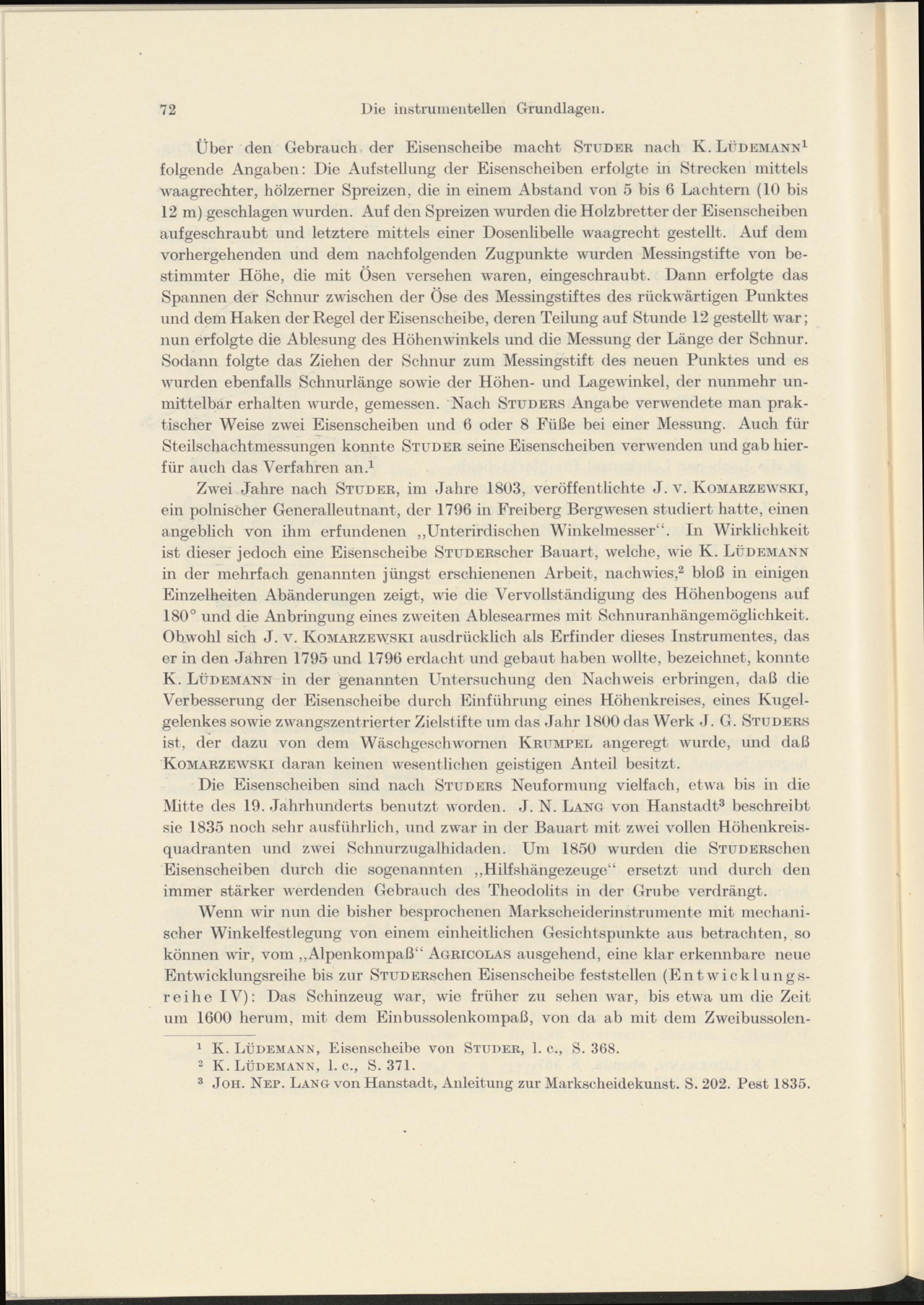 Zwei Jahre nach Studer, im Jahre 1803, veröffentlichte J. v. Komarzewski, ein polnischer Generalleutnant, der 1796 in Freiberg Bergwesen studiert hatte, einen angeblich von ihm erfundenen „Unterirdischen Winkelmesser“. In Wirklichkeit ist dieser jedoch eine Eisenscheibe STUDERscher Bauart, welche, wie K. Lüdemann in der mehrfach genannten jüngst erschienenen Arbeit, nach wies, 2 bloß in einigen Einzelheiten Abänderungen zeigt, wie die Vervollständigung des Höhenbogens auf 180° und die Anbringung eines zweiten Ablesearmes mit Schnuranhängemöglichkeit. Obwohl sich J. v. Komarzewski ausdrücklich als Erfinder dieses Instrumentes, das er in den Jahren 1795 und 1796 erdacht und gebaut haben wollte, bezeichnet, konnte K. Lüdemann in der genannten Untersuchung den Nachweis erbringen, daß die Verbesserung der Eisenscheibe durch Einführung eines Höhenkreises, eines Kugelgelenkes sowie zwangszentrierter Zielstifte um das »fahr 1800 das Werk -1. G. Studers ist, der dazu von dem Wäschgesch women Krumpel angeregt wurde, und daß Komarzewski daran keinen wesentlichen geistigen Anteil besitzt.