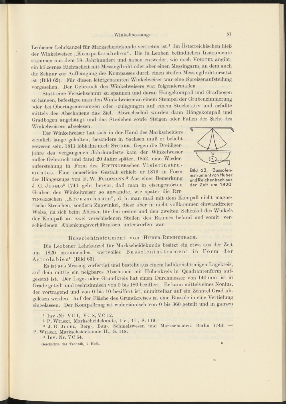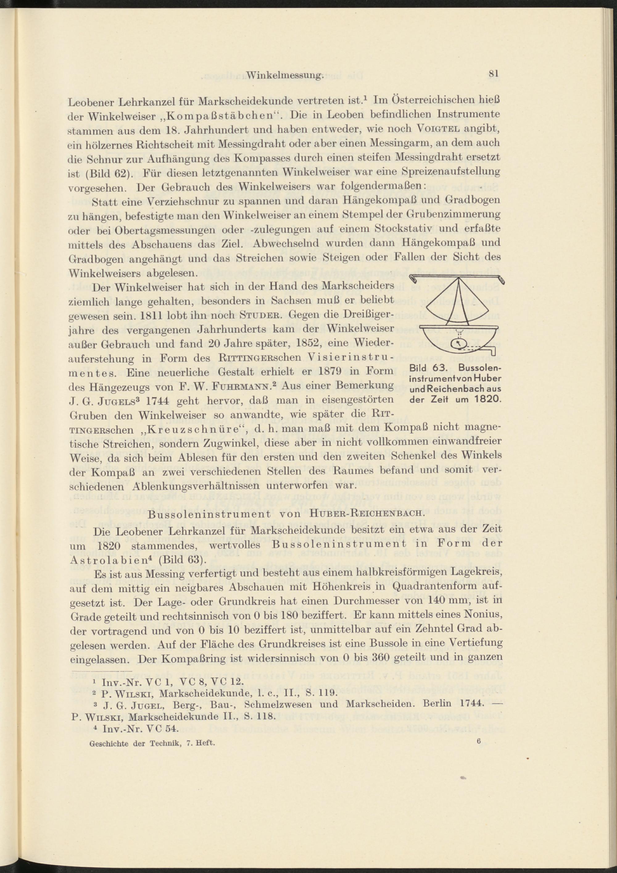 Der Winkelweiser hat sich in der Hand des Markscheiders ziemlich lange gehalten, besonders in Sachsen muß er beliebt gewesen sein. 1811 lobt ihn noch Studer. Gegen die Dreißigerjahre des vergangenen Jahrhunderts kam der Winkelweiser außer Gebrauch und fand 20 Jahre später, 1852, eine Wiederauferstehung in Form des RiTTiNGERschen Visierinstrumentes. Eine neuerliche Gestalt erhielt er 1879 in Form des Hangezeugs von F. W. Fuhrmann. 2 Aus einer Bemerkung J. G. Jugels 3 1744 geht hervor, daß man in eisengestörten Gruben den Winkelweiser so anwandte, wie später die Rit- TiNGERschen „Kreuzschnüre“, d. h. man maß mit dem Kompaß nicht magnetische Streichen, sondern Zugwinkel, diese aber in nicht vollkommen einwandfreier Weise, da sich beim Ablesen für den ersten und den zweiten Schenkel des Winkels der Kompaß an zwei verschiedenen Stellen des Raumes befand und somit verschiedenen AblenkungsVerhältnissen unterworfen war.