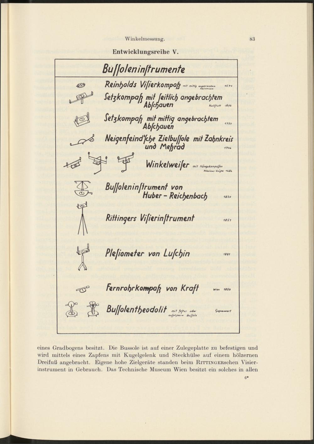 eines Gradbogens besitzt. Die Bussole ist auf einer Zulegeplatte zu befestigen und wird mittels eines Zapfens mit Kugelgelenk und Steckhülse auf einem hölzernen Dreifuß angebracht. Eigene hohe Zielgeräte standen beim RiTTiNGERschen Visierinstrument in Gebrauch. Das Technische Museum Wien besitzt ein solches in allen