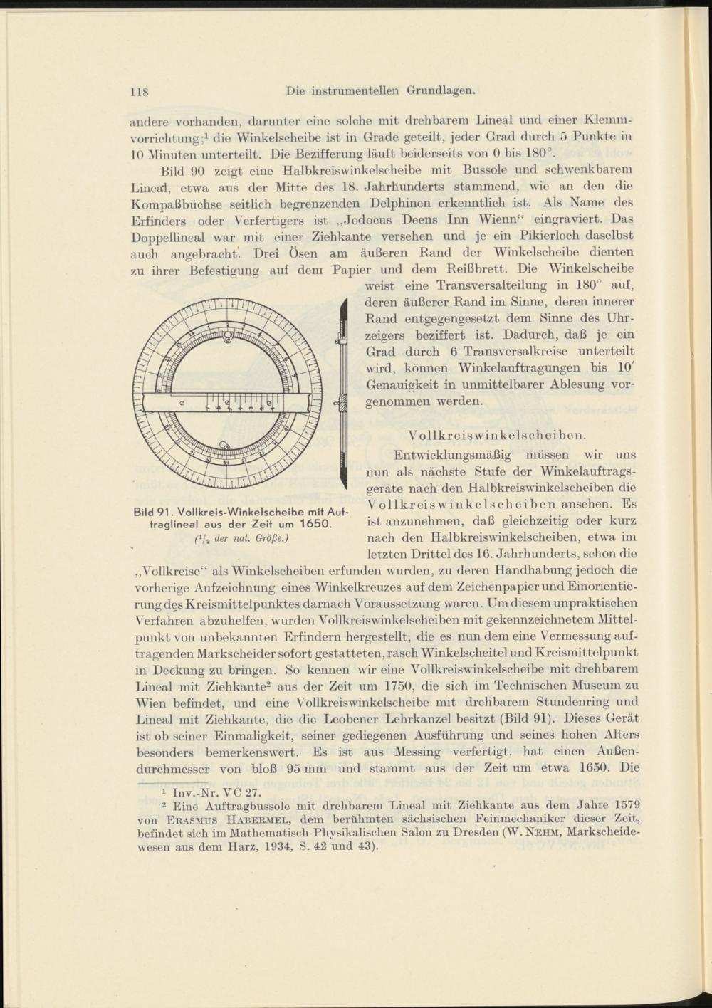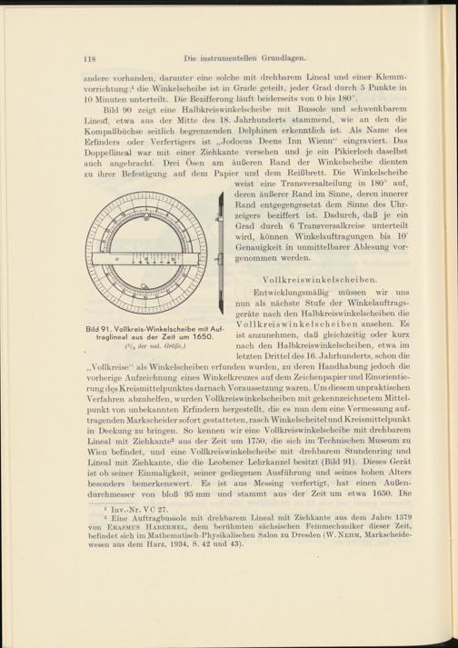 Bild 90 zeigt eine Halbkreiswinkelscheibe mit Bussole und schwenkbarem Lineal, etwa aus der Mitte des 18. Jahrhunderts stammend, wie an den die Kompaßbüchse seitlich begrenzenden Delphinen erkenntlich ist. Als Name des Erfinders oder Verfertigers ist „Jodocus Deens Inn Wienn“ eingraviert. Das Doppellineal war mit einer Ziehkante versehen und je ein Pikierloch daselbst auch angebracht’ Drei Ösen am äußeren Rand der Winkelscheibe dienten zu ihrer Befestigung auf dem Papier und dem Reißbrett. Die Winkelscheibe