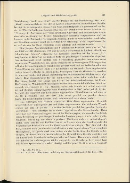 Eine jüngere Ausführungsform der Schmöllnitzer Scheiben, etwa aus der Zeit um 1800 bis 1820 stammend, tritt uns in Gestalt der zweiten in Leoben befindlichen Schmöllnitzer Scheibe 1 entgegen. Als Hersteller derselben ist der Name „J. C. Voigtlaender in Wien“ an der rechten Seite des geradlinigen Ansatzrandes eingeritzt. Das Auftraggerät weist insofern eine Verbesserung gegenüber den ersten oberungarischen Winkelscheiben auf, als die Reißschiene in einer eigenen Rührung unterhalb des Kreismittelpunktes verschiebbar geführt wird und an Stelle der schmalen Ableseöffnung am kurzen Ende der Reißschiene ein senkrecht dazu angebrachtes breites Fenster tritt, das mit einem radial befestigten Haar als Ablesemarke versehen ist, um eine rasche und genaue Einstellung des aufzutragenden Winkels zu ermöglichen. Eine Sperrschraube für die Winkelscheibe selbst fehlt auch hier nicht. Das Lineal besitzt eine Länge von 64 cm, der Scheibendurchmesser ist 11 cm. Die Teilung der Winkelscheibe ist doppelt wie bei den älteren Schmöllnitzer Scheiben, nämlich widersinnisch in 1x24 Stunden, wobei jede Stunde in 8 Achtel unterteilt ist und ebenfalls entgegengesetzt dem Uhrzeigersinn in 360°, wobei jedoch, in Anbetracht des senkrecht zur Reißschiene angebrachten Einstellfensters und -haares, die 12—24-Stunden- und 180—360°-Linie nicht parallel zur geraden Ansatzkante der Schmöllnitzer Scheibe läuft, sondern senkrecht darauf steht.