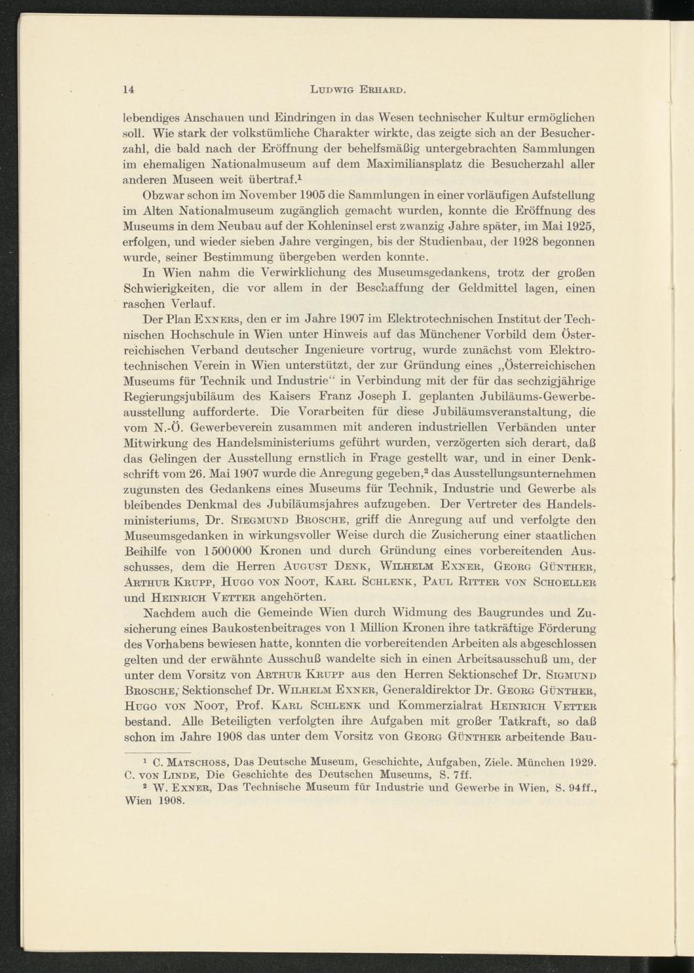Der Plan Exners, den er im Jahre 1907 im Elektrotechnischen Institut der Technischen Hochschule in Wien unter Hinweis auf das Münchener Vorbild dem Österreichischen Verband deutscher Ingenieure vortrug, wurde zunächst vom Elektrotechnischen Verein in Wien unterstützt, der zur Gründung eines „Österreichischen Museums für Technik und Industrie“ in Verbindung mit der für das sechzig]ährige Regierungsjubiläum des Kaisers Franz Joseph I. geplanten Jubiläums-Gewerbe- ausstellung auf forderte. Die Vorarbeiten für diese Jubiläums Veranstaltung, die vom N.-Ö. Gewerbeverein zusammen mit anderen industriellen Verbänden unter Mitwirkung des Handelsministeriums geführt wurden, verzögerten sich derart, daß das Gelingen der Ausstellung ernstlich in Frage gestellt war, und in einer Denkschrift vom 26. Mai 1907 wurde die Anregung gegeben, 2 das Ausstellungsunternehmen zugunsten des Gedankens eines Museums für Technik, Industrie und Gewerbe als bleibendes Denkmal des Jubiläumsjahres aufzugeben. Der Vertreter des Handelsministeriums, Dr. Siegmund Brosche, griff die Anregung auf und verfolgte den Museumsgedanken in wirkungsvoller Weise durch die Zusicherung einer staatlichen Beihilfe von 1500000 Kronen und durch Gründung eines vorbereitenden Ausschusses, dem die Herren August Denk, Wilhelm Exner, Georg Günther, Arthur Krupp, Hugo von Noot, Karl Schlenk, Paul Ritter von Schoeller und Heinrich Vetter angehörten.