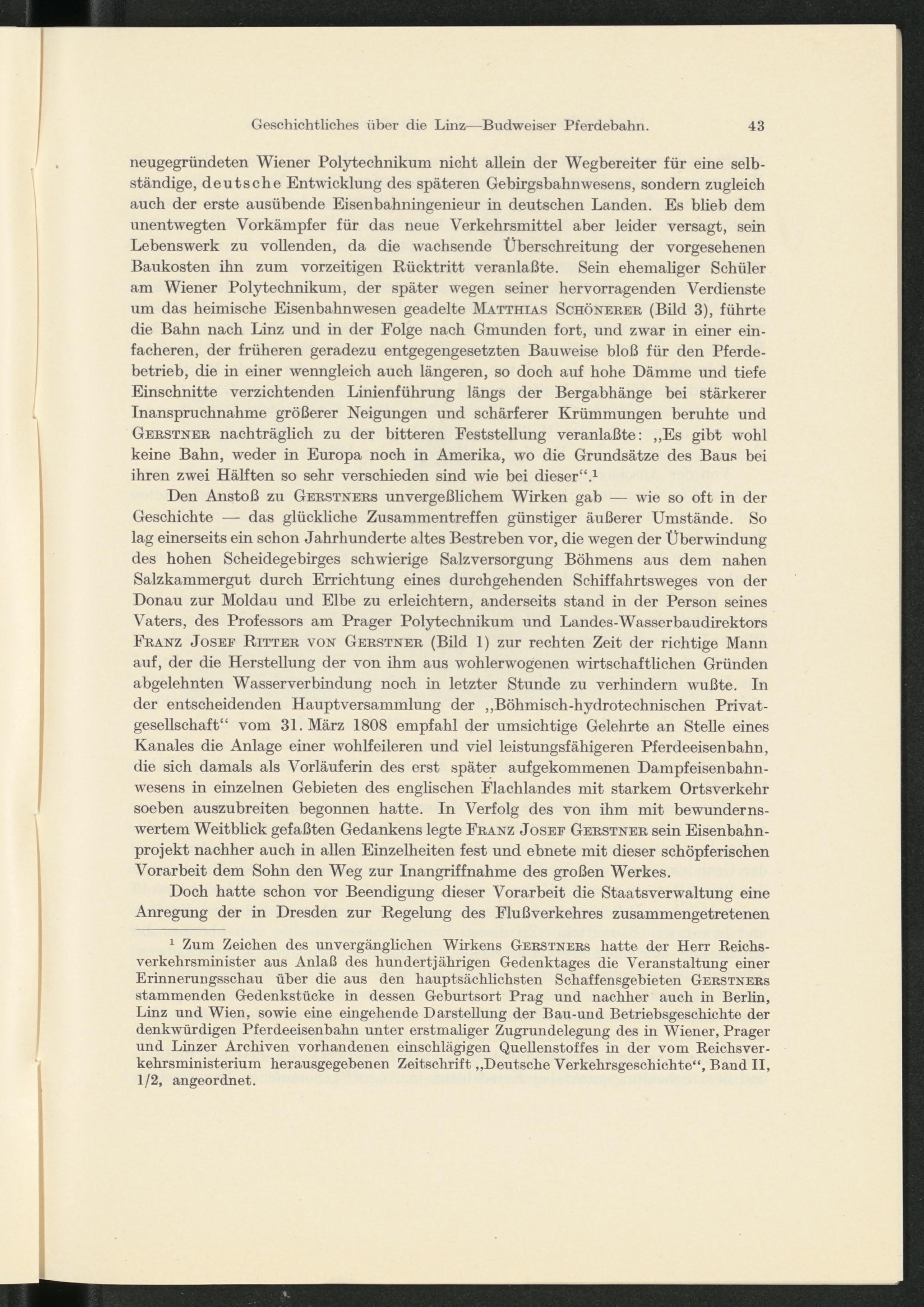 1 Zum Zeichen des unvergänglichen Wirkens Gerstners hatte der Herr Reichsverkehrsminister aus Anlaß des hundertjährigen Gedenktages die Veranstaltung einer Erinnerungsschau über die aus den hauptsächlichsten Schaffensgebieten Gerstners stammenden Gedenkstücke in dessen Geburtsort Prag und nachher auch in Berlin, Linz und Wien, sowie eine eingehende Darstellung der Bau-und Betriebsgeschichte der denkwürdigen Pferdeeisenbahn unter erstmaliger Zugrundelegung des in Wiener, Prager und Linzer Archiven vorhandenen einschlägigen Quellenstoffes in der vom Reichsverkehrsministerium herausgegebenen Zeitschrift „Deutsche Verkehrsgeschichte“, Band II, 1/2, angeordnet.