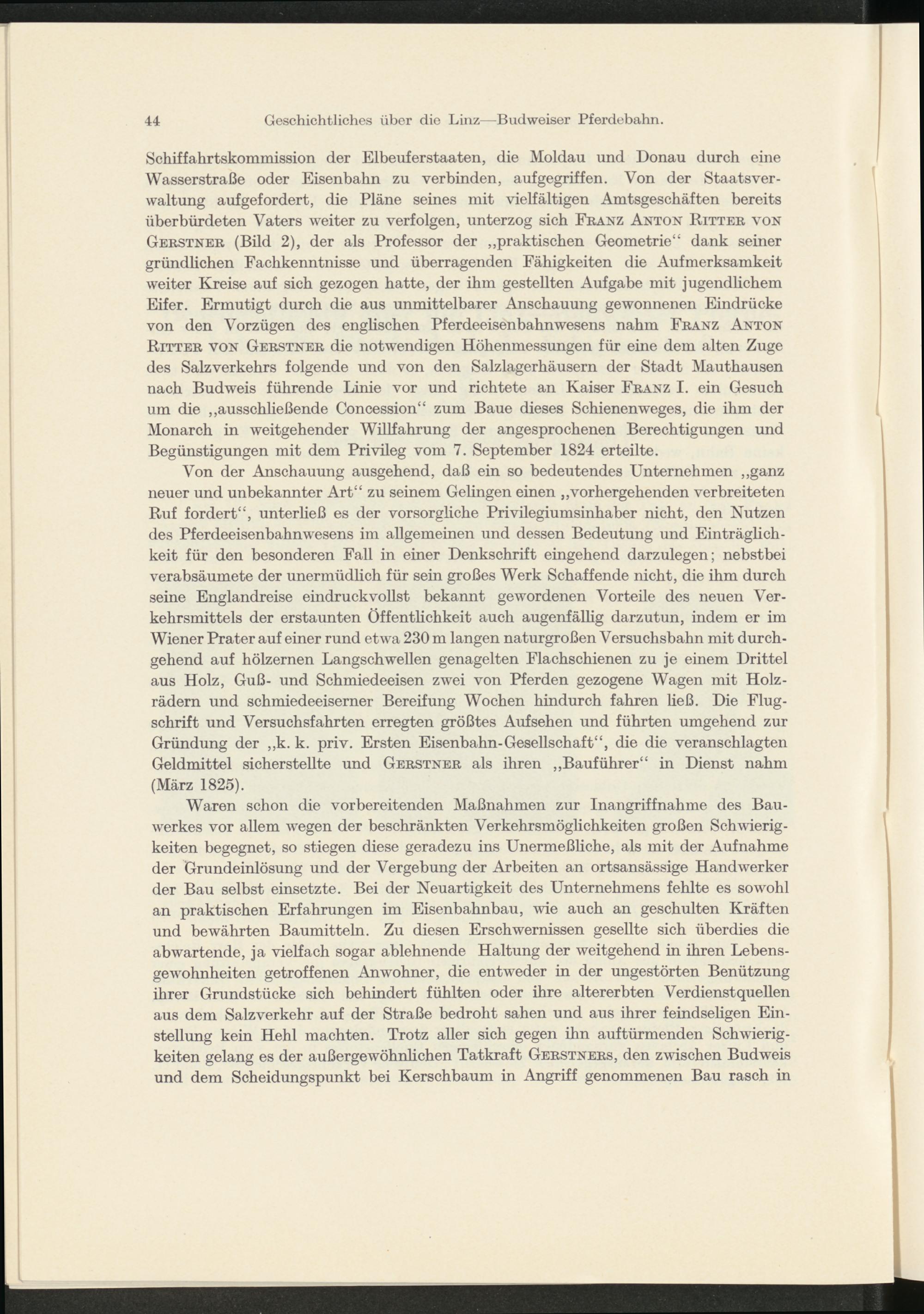 Schiffahrtskommission der Elbeuferstaaten, die Moldau und Donau durch eine Wasserstraße oder Eisenbahn zu verbinden, aufgegriffen. Von der Staatsverwaltung aufgefordert, die Pläne seines mit vielfältigen Amtsgeschäften bereits überbürdeten Vaters weiter zu verfolgen, unterzog sich Franz Anton Ritter von Gerstner (Bild 2), der als Professor der „praktischen Geometrie“ dank seiner gründlichen Fachkenntnisse und überragenden Fähigkeiten die Aufmerksamkeit weiter Kreise auf sich gezogen hatte, der ihm gestellten Aufgabe mit jugendlichem Eifer. Ermutigt durch die aus unmittelbarer Anschauung gewonnenen Eindrücke von den Vorzügen des englischen Pferdeeisenbahnwesens nahm Franz Anton Ritter von Gerstner die notwendigen Höhenmessungen für eine dem alten Zuge des Salzverkehrs folgende und von den Salzlagerhäusern der Stadt Mauthausen nach Budweis führende Linie vor und richtete an Kaiser Franz I. ein Gesuch um die „ausschließende Concession“ zum Baue dieses Schienenweges, die ihm der Monarch in weitgehender Willfahrung der angesprochenen Berechtigungen und Begünstigungen mit dem Privileg vom 7. September 1824 erteilte.
