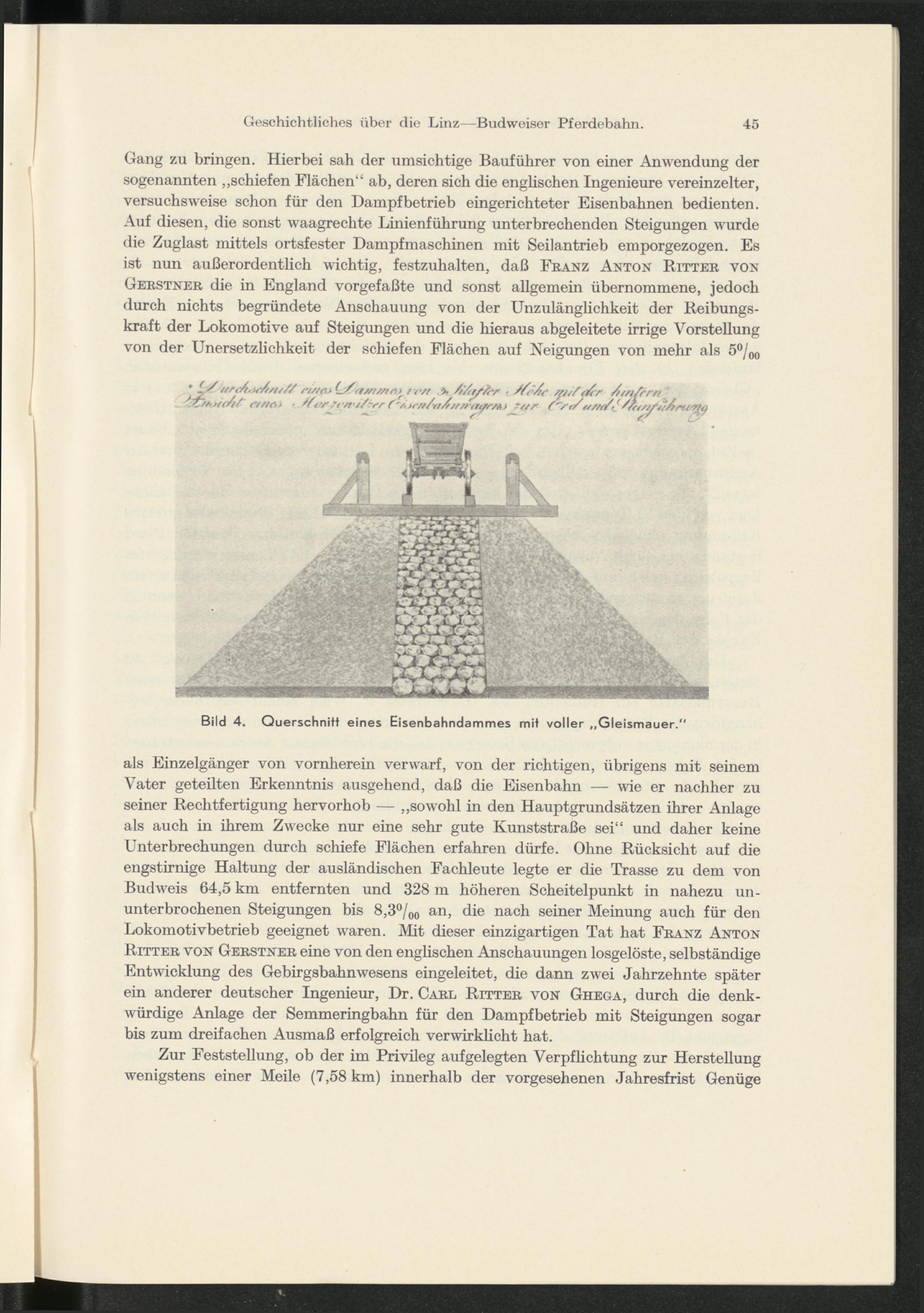 als Einzelgänger von vornherein verwarf, von der richtigen, übrigens mit seinem Vater geteilten Erkenntnis ausgehend, daß die Eisenbahn — wie er nachher zu seiner Rechtfertigung hervorhob — „sowohl in den Hauptgrundsätzen ihrer Anlage als auch in ihrem Zwecke nur eine sehr gute Kunststraße sei“ und daher keine Unterbrechungen durch schiefe Flächen erfahren dürfe. Ohne Rücksicht auf die engstirnige Haltung der ausländischen Fachleute legte er die Trasse zu dem von Budweis 64,5 km entfernten und 328 m höheren Scheitelpunkt in nahezu ununterbrochenen Steigungen bis 8,3°/ 00 an, die nach seiner Meinung auch für den Lokomotivbetrieb geeignet waren. Mit dieser einzigartigen Tat hat Franz Anton Ritter von Gerstner eine von den englischen Anschauungen losgelöste, selbständige Entwicklung des Gebirgsbahnwesens eingeleitet, die dann zwei Jahrzehnte später ein anderer deutscher Ingenieur, Dr. Carl Ritter von Ghega, durch die denkwürdige Anlage der Semmeringbahn für den Dampfbetrieb mit Steigungen sogar bis zum dreifachen Ausmaß erfolgreich verwirklicht hat.