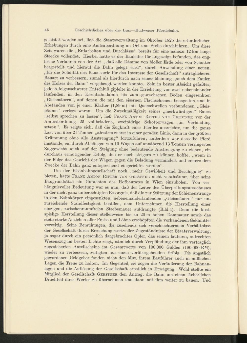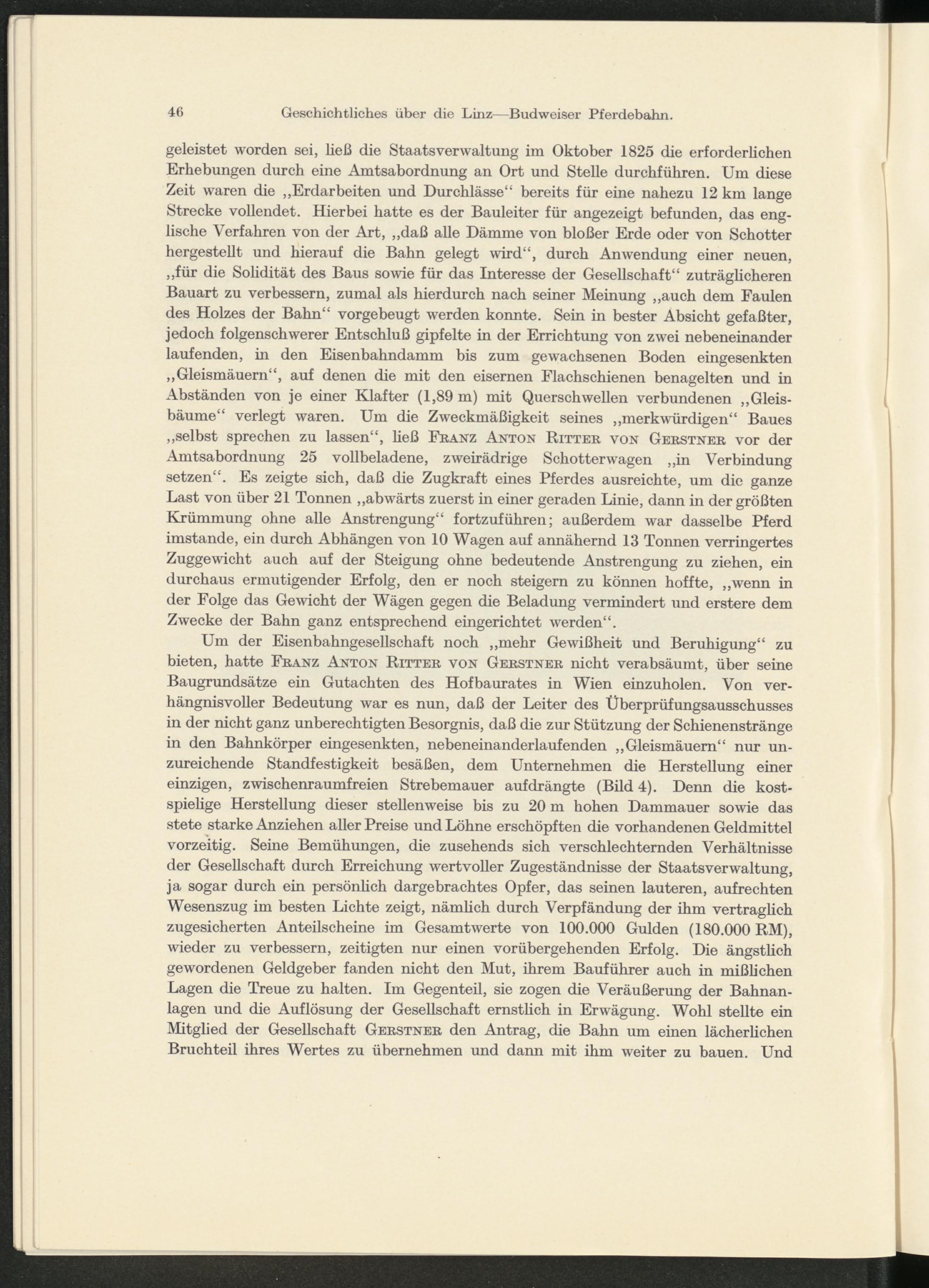 geleistet worden sei, ließ die Staatsverwaltung im Oktober 1825 die erforderlichen Erhebungen durch eine Amtsabordnung an Ort und Stelle durchführen. Um diese Zeit waren die „Erdarbeiten und Durchlässe“ bereits für eine nahezu 12 km lange Strecke vollendet. Hierbei hatte es der Bauleiter für angezeigt befunden, das englische Verfahren von der Art, „daß alle Dämme von bloßer Erde oder von Schotter hergestellt und hierauf die Bahn gelegt wird“, durch Anwendung einer neuen, „für die Solidität des Baus sowie für das Interesse der Gesellschaft“ zuträglicheren Bauart zu verbessern, zumal als hierdurch nach seiner Meinung „auch dem Faulen des Holzes der Bahn“ vorgebeugt werden konnte. Sein in bester Absicht gefaßter, jedoch folgenschwerer Entschluß gipfelte in der Errichtung von zwei nebeneinander laufenden, in den Eisenbahndamm bis zum gewachsenen Boden eingesenkten „Gleismäuern“, auf denen die mit den eisernen Flachschienen benagelten und in Abständen von je einer Klafter (1,89 m) mit Querschwellen verbundenen „Gleisbäume“ verlegt waren. Um die Zweckmäßigkeit seines „merkwürdigen“ Baues „selbst sprechen zu lassen“, ließ Franz Anton Ritter von Gerstner vor der Amtsabordnung 25 vollbeladene, zweirädrige Schotterwagen „in Verbindung setzen“. Es zeigte sich, daß die Zugkraft eines Pferdes ausreichte, um die ganze Last von über 21 Tonnen „abwärts zuerst in einer geraden Linie, dann in der größten Krümmung ohne alle Anstrengung“ fortzuführen; außerdem war dasselbe Pferd imstande, ein durch Abhängen von 10 Wagen auf annähernd 13 Tonnen verringertes Zuggewicht auch auf der Steigung ohne bedeutende Anstrengung zu ziehen, ein durchaus ermutigender Erfolg, den er noch steigern zu können hoffte, „wenn in der Folge das Gewicht der Wägen gegen die Beladung vermindert und erstere dem Zwecke der Bahn ganz entsprechend eingerichtet werden“.
