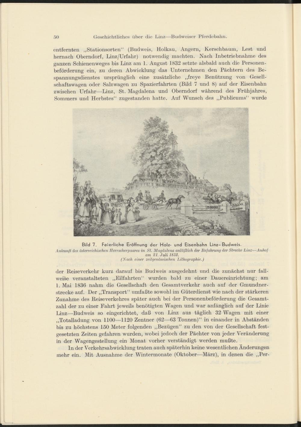 entfernten „Stationsorten“ (Budweis, Holkau, Angern, Kerschbaum, Lest und hernach Oberndorf, Linz/Urfahr) notwendig machten. Nach Inbetriebnahme des ganzen Schienenweges bis Linz am 1. August 1832 setzte alsbald auch die Personenbeförderung ein, zu deren Abwicklung das Unternehmen den Pächtern des Bespannungsdienstes ursprünglich eine zusätzliche ,,freye Benützung von Gesellschaftswagen oder Salzwagen zu Spazierfahrten (Bild 7 und 8) auf der Eisenbahn zwischen Urfahr—Linz, St. Magdalena und Oberndorf während des Frühjahres, Sommers und Herbstes“ zugestanden hatte. Auf Wunsch des „Publicums“ wurde