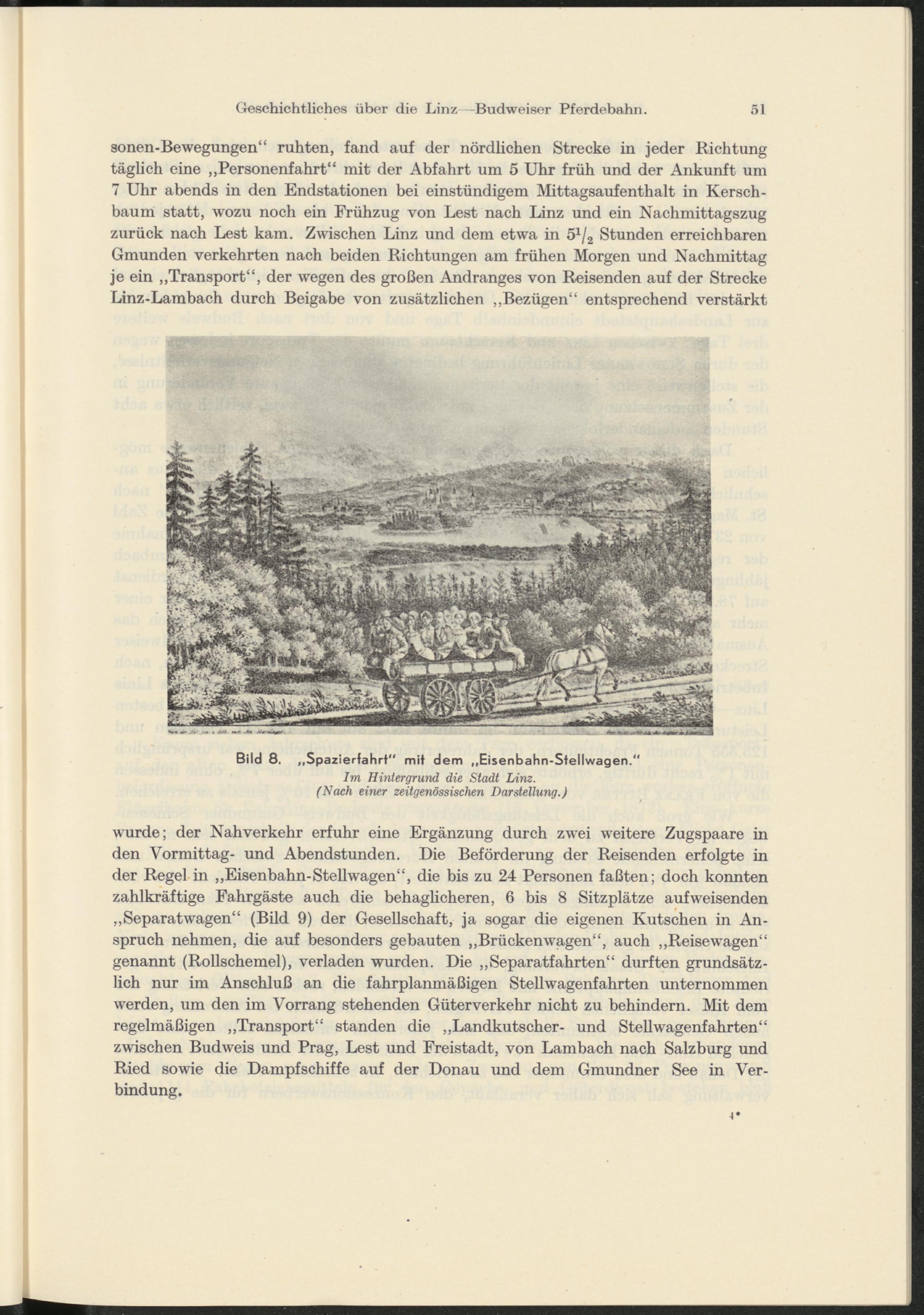 wurde; der Nahverkehr erfuhr eine Ergänzung durch zwei weitere Zugspaare in den Vormittag- und Abendstunden. Die Beförderung der Reisenden erfolgte in der Regel in „Eisenbahn-Stell wagen“, die bis zu 24 Personen faßten; doch konnten zahlkräftige Fahrgäste auch die behaglicheren, 6 bis 8 Sitzplätze aufweisenden „Separatwagen“ (Bild 9) der Gesellschaft, ja sogar die eigenen Kutschen in Anspruch nehmen, die auf besonders gebauten „Brückenwagen“, auch „Reisewagen“ genannt (Rollschemel), verladen wurden. Die „Separatfahrten“ durften grundsätzlich nur im Anschluß an die fahrplanmäßigen Stellwagenfahrten unternommen werden, um den im Vorrang stehenden Güterverkehr nicht zu behindern. Mit dem regelmäßigen „Transport“ standen die „Landkutscher- und Stellwagenfahrten“ zwischen Budweis und Prag, Lest und Freistadt, von Lambach nach Salzburg und Ried sowie die Dampfschiffe auf der Donau und dem Gmundner See in Verbindung.
