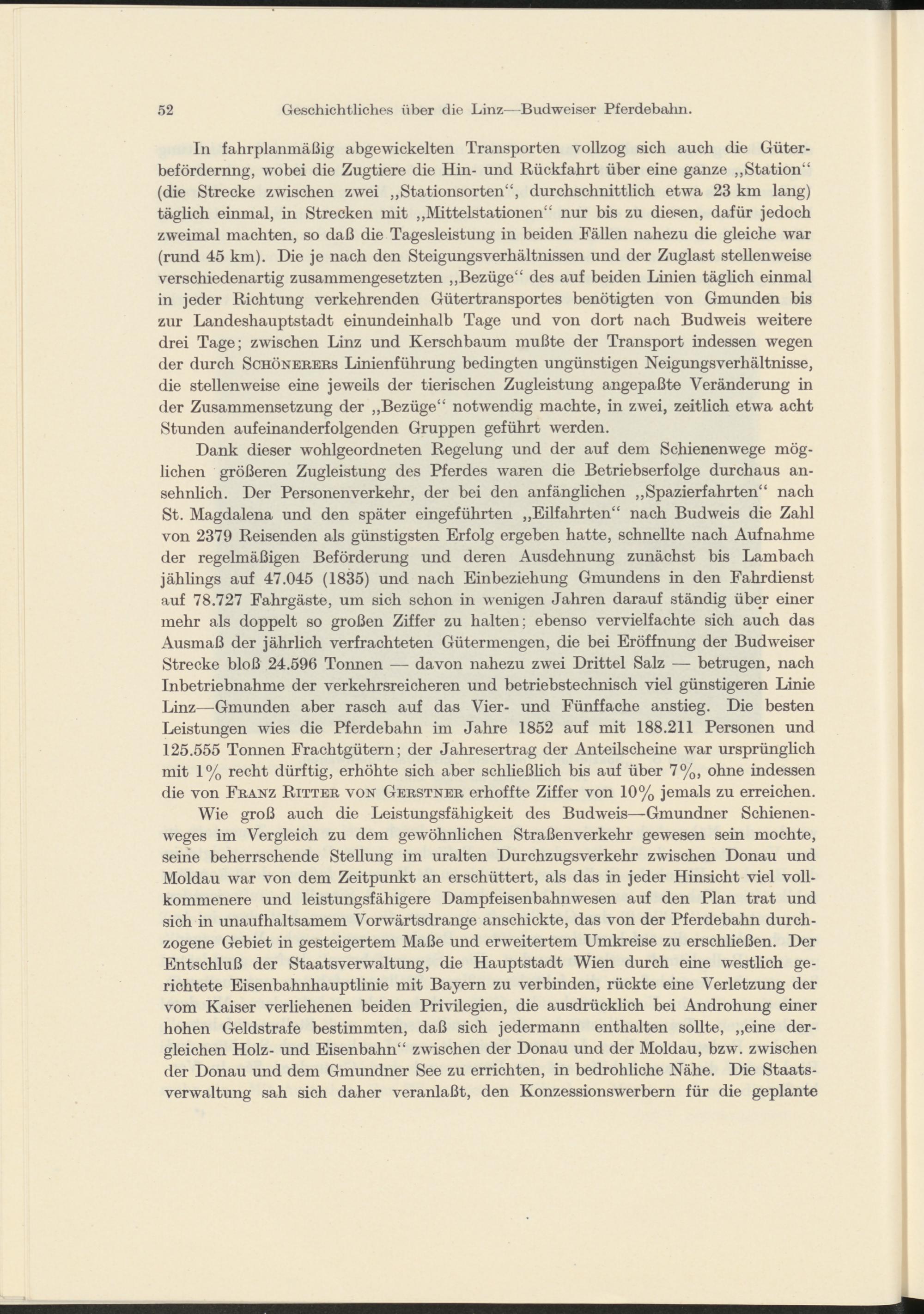 In fahrplanmäßig abgewickelten Transporten vollzog sich auch die Güter- befördernng, wobei die Zugtiere die Hin- und Rückfahrt über eine ganze „Station“ (die Strecke zwischen zwei „Stationsorten“, durchschnittlich etwa 23 km lang) täglich einmal, in Strecken mit „Mittelstationen“ nur bis zu diesen, dafür jedoch zweimal machten, so daß die Tagesleistung in beiden Fällen nahezu die gleiche war (rund 45 km). Die je nach den Steigungsverhältnissen und der Zuglast stellenweise verschiedenartig zusammengesetzten „Bezüge“ des auf beiden Linien täglich einmal in jeder Richtung verkehrenden Gütertransportes benötigten von Gmunden bis zur Landeshauptstadt einundeinhalb Tage und von dort nach Budweis weitere drei Tage; zwischen Linz und Kerschbaum mußte der Transport indessen wegen der durch Schönebers Linienführung bedingten ungünstigen Neigungsverhältnisse, die stellenweise eine jeweils der tierischen Zugleistung angepaßte Veränderung in der Zusammensetzung der „Bezüge“ notwendig machte, in zwei, zeitlich etwa acht Stunden aufeinanderfolgenden Gruppen geführt werden.