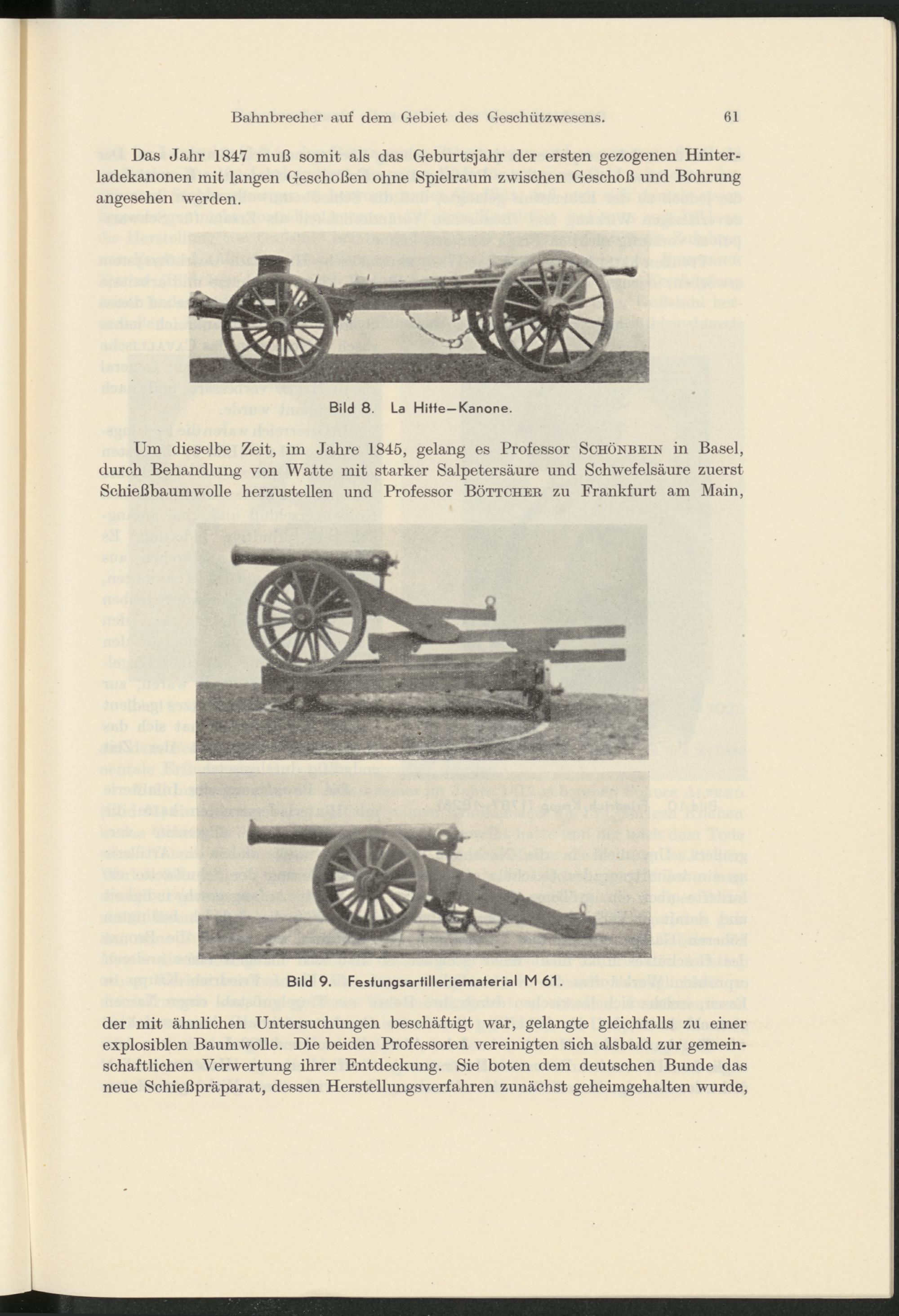 Um dieselbe Zeit, im Jahre 1845, gelang es Professor Schönbein in Basel, durch Behandlung von Watte mit starker Salpetersäure und Schwefelsäure zuerst Schießbaumwolle herzustellen und Professor Böttcher zu Frankfurt am Main,