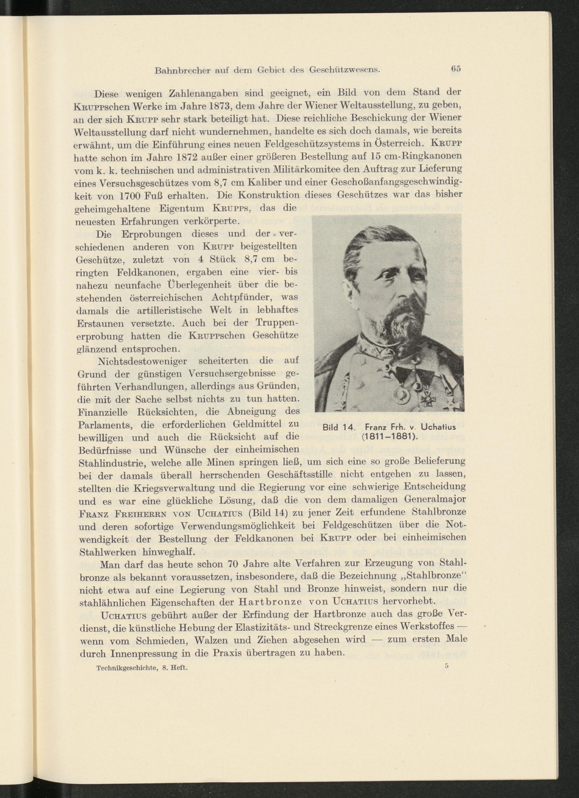 Finanzielle Rücksichten, die Abneigung des Parlaments, die erforderlichen Geldmittel zu bewilligen und auch die Rücksicht auf die Bedürfnisse und Wünsche der einheimischen Stahlindustrie, welche alle Minen springen Heß, um sich eine so große Belieferung bei der damals überall herrschenden Geschäftsstille nicht entgehen zu lassen, stellten die Kriegsverwaltung und die Regierung vor eine schwierige Entscheidung und es war eine glückliche Lösung, daß die von dem damaligen Generalmajor Franz Freiherrn von Uchatius (Bild 14) zu jener Zeit erfundene Stahlbronze und deren sofortige Verwendungsmöglichkeit bei Feldgeschützen über die Notwendigkeit der Bestellung der Feldkanonen bei Krupp oder bei einheimischen Stahlwerken hinweghalf.