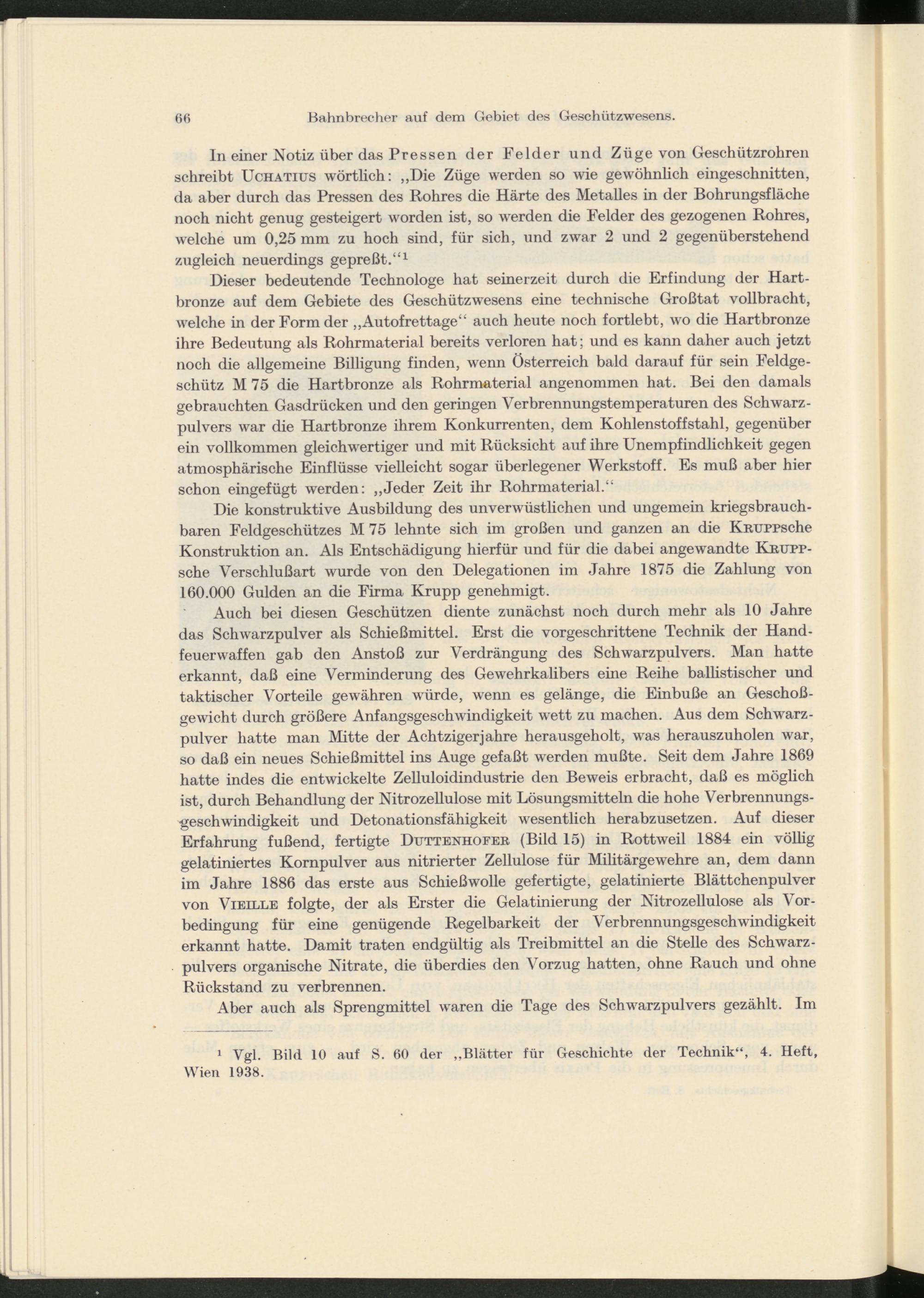 Dieser bedeutende Technologe hat seinerzeit durch die Erfindung der Hartbronze auf dem Gebiete des Geschützwesens eine technische Großtat vollbracht, welche in der Form der „Autofrettage“ auch heute noch fortlebt, wo die Hartbronze ihre Bedeutung als Rohrmaterial bereits verloren hat; und es kann daher auch jetzt noch die allgemeine Billigung finden, wenn Österreich bald darauf für sein Feldgeschütz M 75 die Hartbronze als Rohrmaterial angenommen hat. Bei den damals gebrauchten Gasdrücken und den geringen Verbrennungstemperaturen des Schwarz - pulvers war die Hartbronze ihrem Konkurrenten, dem Kohlenstoffstahl, gegenüber ein vollkommen gleichwertiger und mit Rücksicht auf ihre Unempfindlichkeit gegen atmosphärische Einflüsse vielleicht sogar überlegener Werkstoff. Es muß aber hier schon eingefügt werden: „Jeder Zeit ihr Rohrmaterial.“