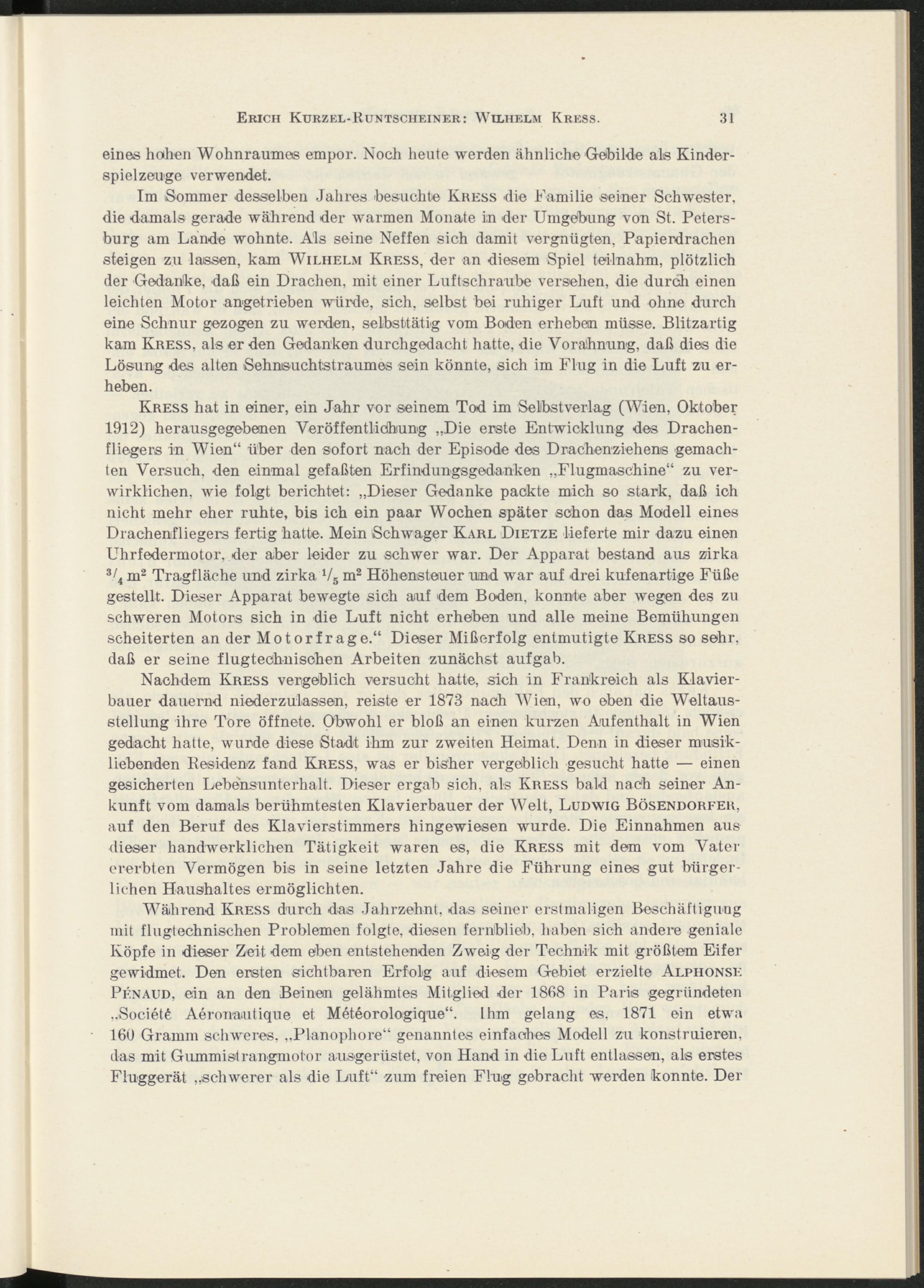 Wäih rend Kress durch das Jahrzehnt, das seiner erstmaligen Beschäftigung mit flugtechnischen Problemen folgte, diesen fernblieb, haben sich andere geniale Köpfe in dieser Zeit dem eben entstehenden Zweig der Technik mit größtem Eifer gewidmet. Den ersten sichtbaren Erfolg auf diesem Gebiet erzielte Alphonse Penaud, ein an den Beinen gelähmtes Mitglied der 1868 in Paris gegründeten „Societfe Aeronautique et Meteorologique“. Ihm gelang es, 1871 ein etwa 160 Gramm schweres, „Planophore“ genanntes einfaches Modell zu konstruieren, das mit Gummistrangmot or ausgerüstet, von Hand in die Luft entlassen, als erstes Fluggerät „schwerer als die Luft“ zum freien Flug gebracht werden konnte. Der