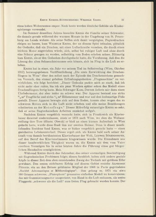 Im Sommer desselben Jahres besuchte Kress die Familie seiner Schwester, die damals gerade während der warmen Monate in der Umgebung von St. Petersburg am Lande wohnte. A'ls seine Neffen sich damit vergnügten, Papierdrachen steigen zu lassen, kam Wilhelm Kress, der an diesem Spiel teilnahm, plötzlich der Gedanke, daß ein Drachen, mit einer Luftschraube versehen, die durch einen leichten Motor angetrieben würde, sich, selbst bei ruhiger Luft und ohne durch eine Schnur gezogen zu werden, selbsttätig vom Boden erheben müsse. Blitzartig kam Kress, als er den Gedanken durchgedacht hatte, die Vorahnung, daß dies die Lösung des alten Sehmsuchtstraumes sein könnte, sich im Flug in die Luft zu erheben.