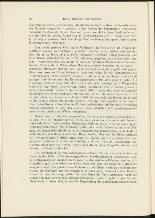 Man hat in späterer Zeit, um die Verdienste, die Kress sich als Pionier der Luftfahrt erwarb, zn verkleinern, glaubhaft machen wollen, daß er während der Zeit, die er im Jahre 1872 in Paris verbrachte, Penauds Arbeit kennengelernt habe. Kress selbst hat hierzu die Veranlassung gegeben; denn er hat selbst einmal — wahrscheinlich, um anläßlich einer der häufigen Diskussionen der avia- tisähen Tafelrunde in Wien seiner Meinung größere Autorität zu verleihen — gegenüber Hermann Hörnes, der ihn im letzten Lebensjahr angriff, und gegenüber Friedrih von Lössl behauptet, „während seines Pariser Aufenthaltes bei Penaud gearbeitet zu haben“. Hieraus wurde dann von seinen Gegnern der Schluß gezogen, daß Kress nur die Erfindungsgedanken Penauds pingiert habe. Als Gegenargument sei angeführt, daß Kress, der sich, nachdem er in Wien seine Lebenshaltung durch Auswertung seines handwerklichen Könnens gesichert hatte, sofort wiederum den Problemen der Luftfahrt zuwandte, wobei er zunächst durch mehrere Jahre, und zwar darum, weil er den Gummistrangmotor nicht kannte, mit seinen Versuchen erfolglos blieb. Ist dies nicht ein Beweis dafür, daß er die damals schon erfolgreiche Bauart Penauds nieht, gesehen haben kann? Denn wäie Kress w-äh rend seines Pariser Aufenthaltes mit Penauds Versuchen bekannt geworden, er hätte den Versuch, seine Modelle mit Gummistrangmotor auszurüsten, nicht erst 1876 unternommen.