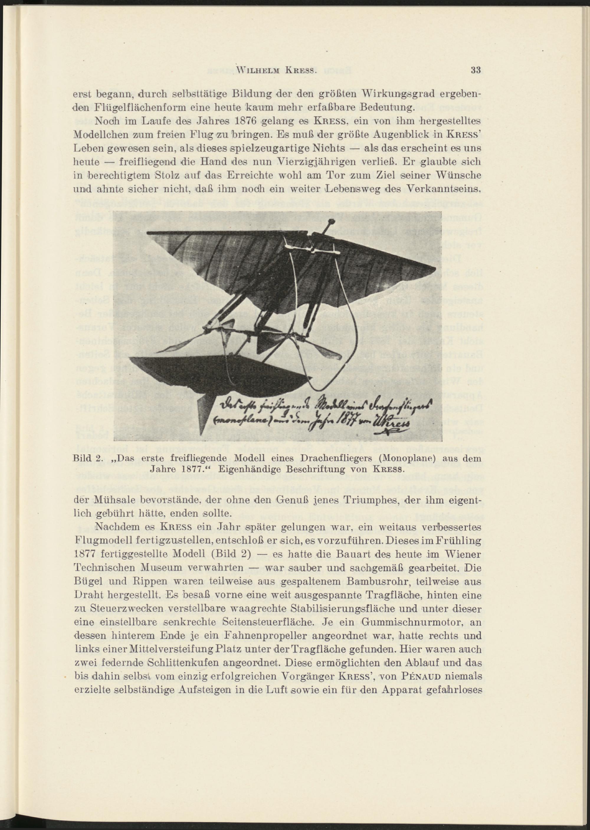 Bild 2. „Das erste freiiliegende Modell eines Drachenfliegers (Monoplane) aus dem Jahre 1877.“ Eigenhändige Beschriftung von Kress.