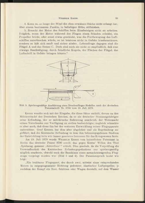Am 19. Juli 1879 wurde Wilhelm Kress vom kaiserlichen Patentamt in Berlin das deutsche Patent 8706 erteilt, das gegen Kress’ Willen den Titel ..Spielzeug, genannt ,Aeroveloce‘ “ erhielt. Dies geschah, da die Vorprüfung die Verwendbarkeit des Kress sehen Erfindungsgedankens nur spielzeugmäßig möglich erachtete, obwohl auch die Bauskizze eines menschentragenden Flugzeugs vorgelegt worden w r ar (Bild 3 und 4). Der Patentanspruch lautet wie folgt: