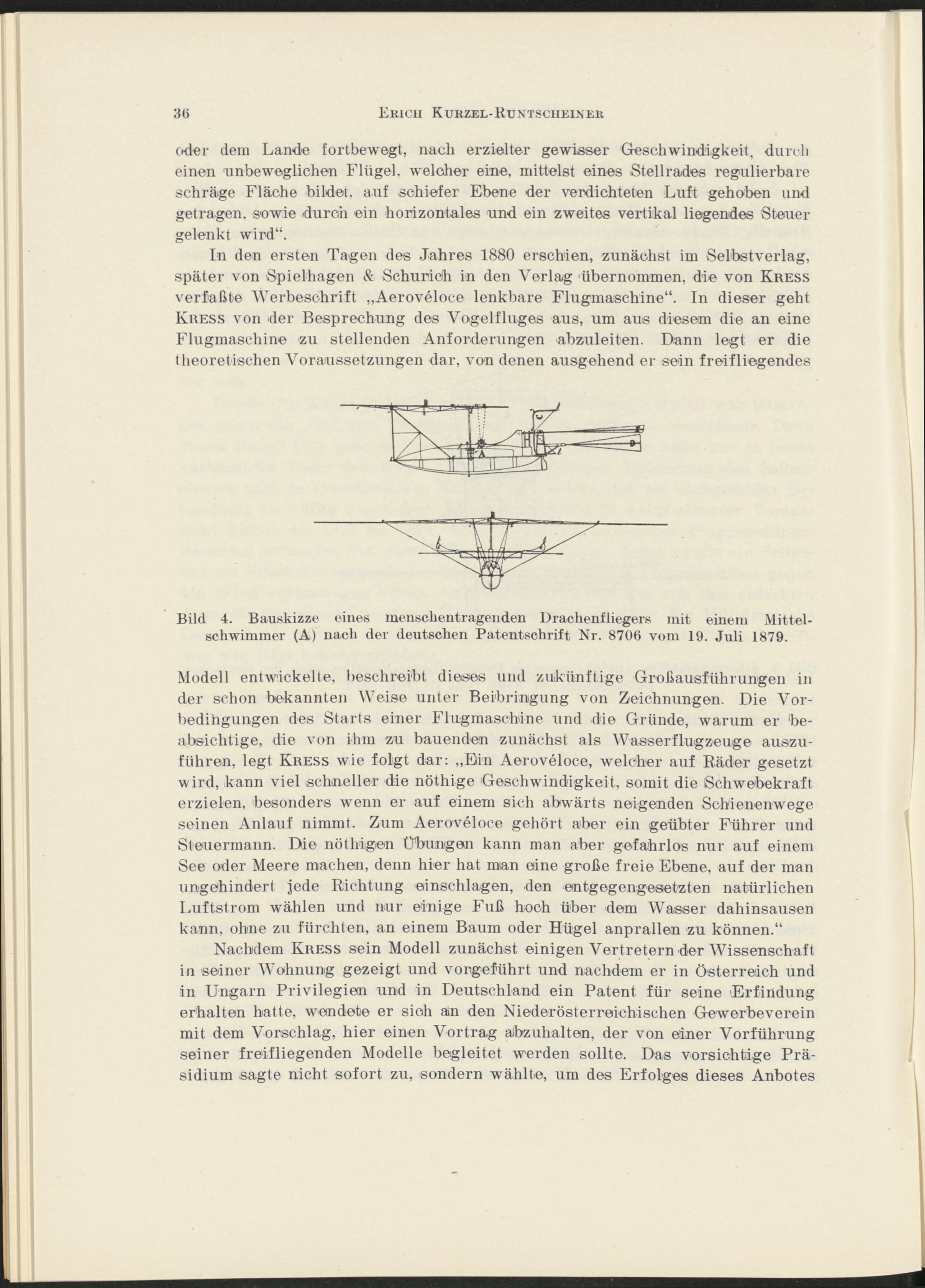 Modell entwickelte, beschreibt dieses und zukünftige Großausführungen in der schon bekannten Weise unter Beibringung von Zeichnungen. Die Vorbedingungen des Starts einer Flugmaschine und die Gründe, warum er beabsichtige, die von ihm zu bauenden zunächst als Wasserflugzeuge auszuführen, legt Kress wie folgt dar: „Ein Aeroveloce, welcher auf Bäder gesetzt wird, kann viel schneller die nöthige Geschwindigkeit, somit die ßchwebekraft erzielen, besonders w r enn er auf einem sich abwärts neigenden Schienenwege seinen Anlauf nimmt. Zum Aeroveloce gehört aber ein geübter Führer und Steuermann. Die nöthigen Übungen kann man aber gefahrlos nur auf einem See oder Meere machen, denn hier hat man eine große freie Ebene, auf der man ungehindert jede Richtung einschlagen, den entgegengesetzten natürlichen Luftstrom wählen und nur einige Fuß hoch über dem Wasser dahinsausen kann, ohne zu fürchten, an einem Baum oder Hügel anprallen zu können.“ Nachdem Kress sein Modell zunächst einigen Vertretern der Wissenschaft in seiner AVohnung gezeigt und vorgeführt und nachdem er in Österreich und in Ungarn Privilegien und in Deutschland ein Patent für seine Erfindung erhalten hatte, wendete er sich an den Niederösterreichischen Gewerbeverein mit dem Vorschlag, hier einen Vortrag abzuhalten, der von einer Vorführung seiner freifliegenden Modelle begleitet werden sollte. Das vorsichtige Präsidium sagte nicht sofort zu, sondern wählte, um des Erfolges dieses Anbotes