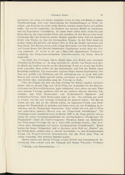 Über die Folgen, die sich aus dem Vortrag für Kress ergaben, berichtet dieser: „Bis zu diesem Tage war ich in Wien, mit Ausnahme bei den Klaviervirtuosen und Klavierfabrikanten, ganz unbekannt, aber schon ein paar Tage nach meinem Vortrage meldeten sich bei mir mehrere Herren, darunter Ing. Lippert und Graf Buonacorsi vom Niederösterr.* Ingenieur- und Architekten-Verein. Graf Buonacorsi sagte zu mir: ,Sie scheinen gar nicht zu wissen, was für eine wichtige Erfindung Sie gemacht haben. 4 Die Herren teilten mir mit, daß sie die Absicht haben, im Ingenieur-Verein eine Fachgruppe für Flugtechnik zu gründen und luden mich ein, zur Gründung zu erscheinen und der Fachgruppe beizutreten. Jetzt erfuhr ich erst, daß in Wien und anderwärts mehrere Herren sich mit Flugtechnik beschäftigen.“ Die Gründung wurde tatsächlich noch im Herbst 1880 in die Wege geleitet und an einem der ersten Versammlungsabende der neubegründeten „Fachgruppe für Flugtechnik“ stand als Gast Vortragender Wilhelm Kress am Rednerpult. Der Titel seines Vortrags, der am 1. April 1881 stattfand, lautete: „Das Aero- veloce unter Bezugnahme auf neuere aerodynamische Grundformeln.“ Kress bewies bei dieser Gelegenheit, daß er durchaus nicht bloß ein „Bastler“ sei, der Erfolg hatte, sondern daß er, obwohl Autodidakt, vor dem fachmännischen Forum von flugtechnisch Interessierten, das das Wien jener Tage zu stellen vermochte, ohne weiteres bestehen konnte.