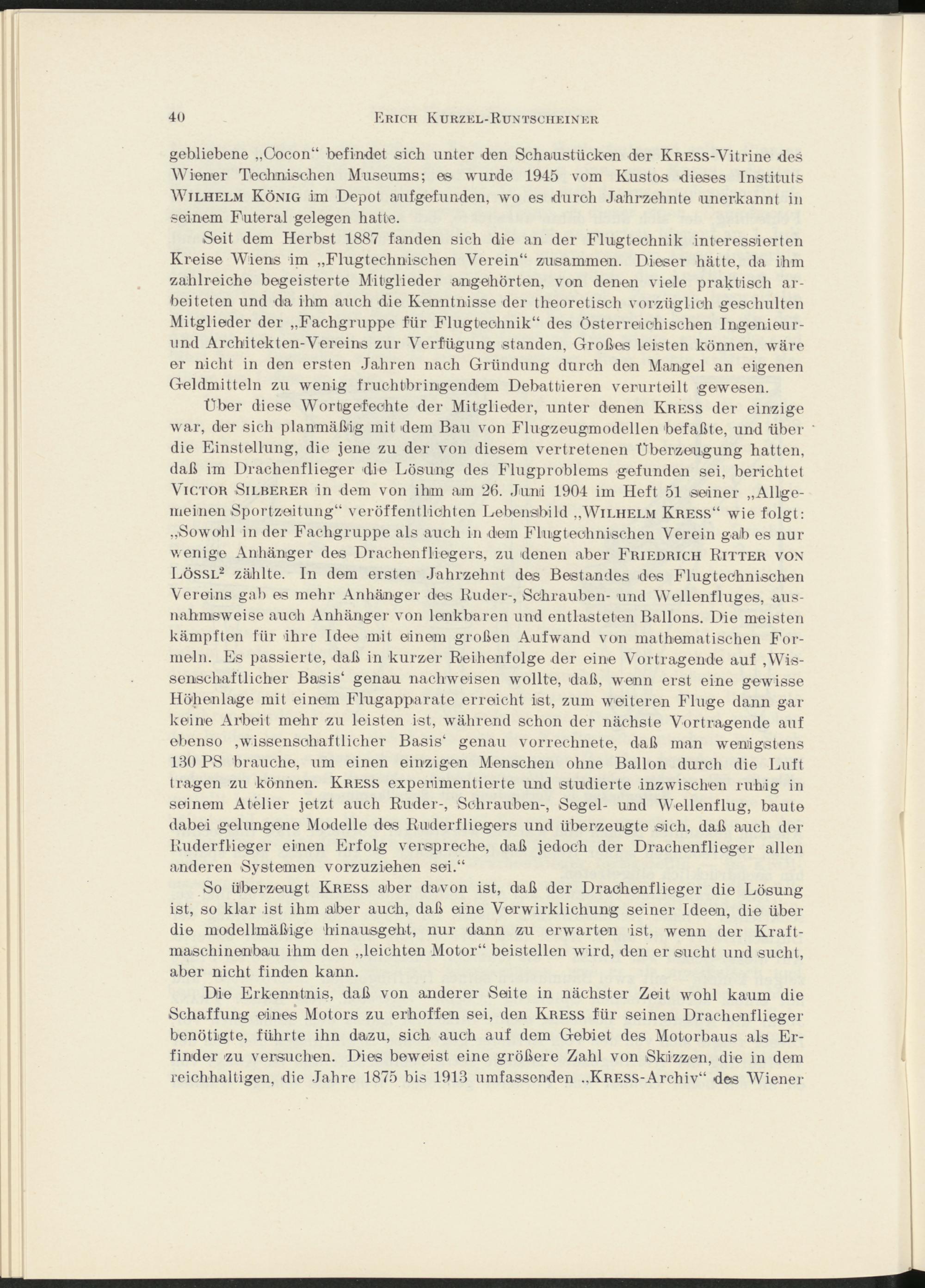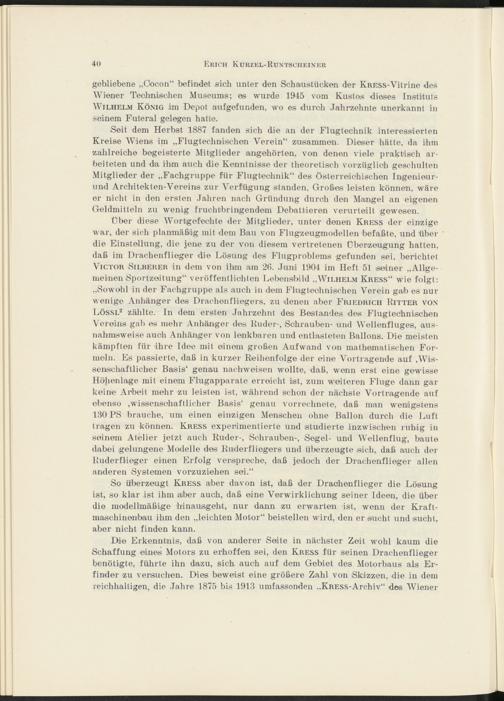 Über diese Wortgefechte der Mitglieder, unter denen Kress der einzige war, der sich planmäßig mit dem Bau von Flugzeugmodellen befaßte, und über die Einstellung, die jene zu der von diesem vertretenen Überzeugung hatten, daß im Drachenflieger die Lösung des Flugproblems gefunden sei, berichtet Victor Silrerer in dem von ihm am 26. Juni 1904 im Heft 51 seiner „Allgemeinen Sportzeitung“ veröffentlichten Lebensbild „Wilhelm Kress“ wie folgt: „Sowohl in der Fachgruppe als auch in dem Flugtechnischen Verein gab es nur wenige Anhänger des Drachenfliegers, zu denen aber Friedrich Ritter von Lössl 2 zählte. In dem ersten Jahrzehnt des Bestandes des Flugtechnischen Vereins gab es mehr Anhänger des Ruder-, Schrauben- und Wellenfluges, ausnahmsweise auch Anhänger von lenkbaren und entlasteten Ballons. Die meisten kämpften für ihre Idee mit einem großen Aufwand von mathematischen Formeln. Es passierte, daß in kurzer Reihenfolge der eine Vortragende auf ,Wissenschaftlicher Basis 4 genau nacliweisen wollte, daß, wenn erst eine gewisse Höhenlage mit einem Flugapparate erreicht ist, zum weiteren Fluge dann gar keine Arbeit mehr zu leisten ist, während schon der nächste Vortragende auf ebenso ,wissenschaftlicher Basis 4 genau vorrechnete, daß man wenigstens 180 PS brauche, um einen einzigen Menschen ohne Ballon durch die Luft tragen zu können. Kress experimentierte und studierte inzwischen ruhig in seinem Atelier jetzt auch Ruder-, Schrauben-, Segel- und Wellenflug, baute dabei gelungene Modelle des Ruderfliegers und überzeugte sich, daß auch der Ruderflieger einen Erfolg verspreche, daß jedoch der Drachenflieger allen anderen Systemen vorzuziehen sei.“