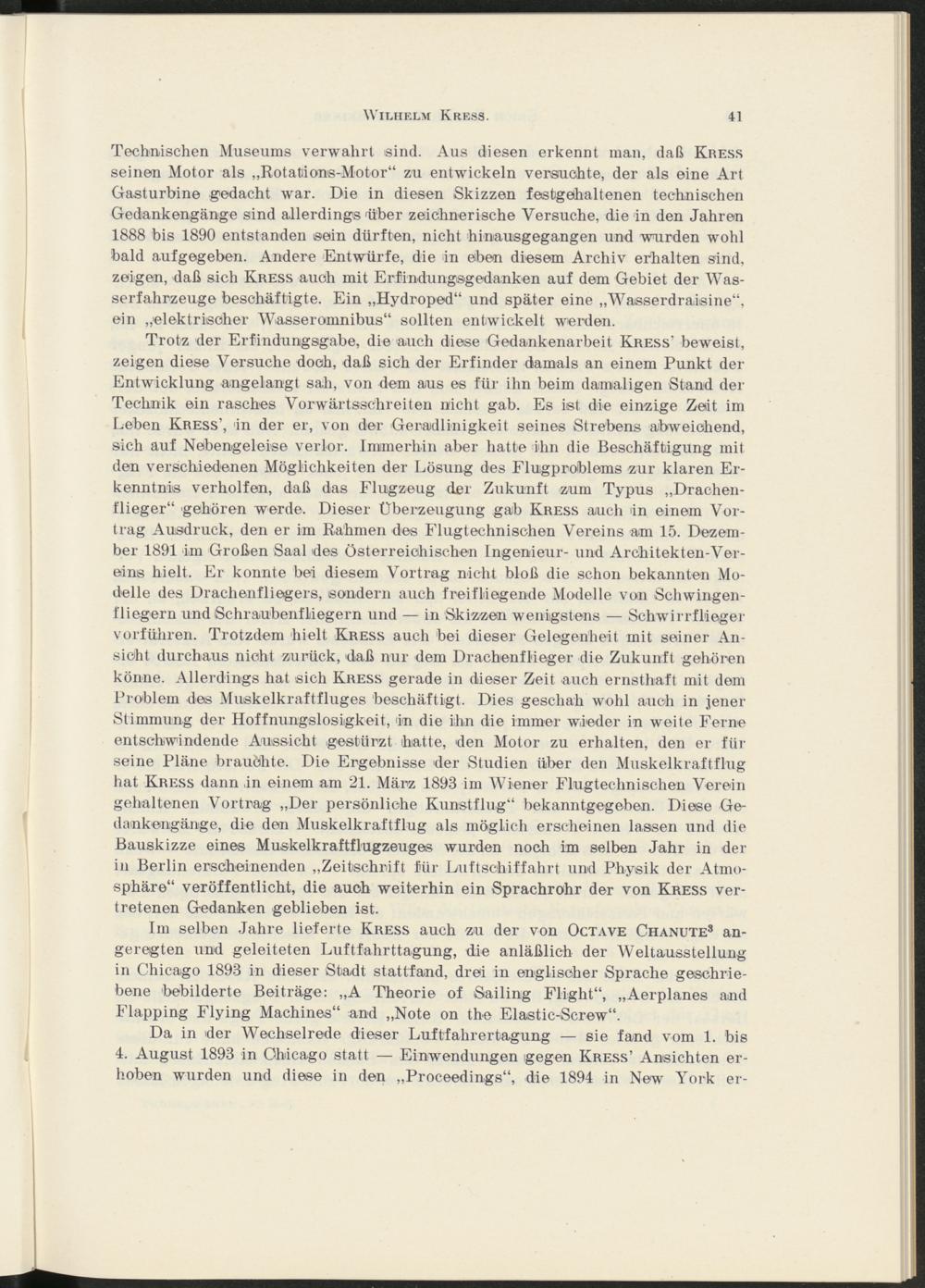 Technischen Museums verwahrt sind. Aus diesen erkennt man, daß Kress seinen Motor als „Rotations-Motor“ zu entwickeln versuchte, der als eine Art Gasturbine gedacht -war. Die in diesen Skizzen festgehaltenen technischen Gediankengänge sind allerdings 'über zeichnerische Versuche, die in den Jahren 1888 bis 1890 entstanden ©ein dürften, nicht hinausgegangen und wurden wohl bald aufgegeben. Andere 'Entwürfe, die in eben diesem Archiv erhalten sind, zeigen, daß sich Kress auch mit Erfindungsgedanken auf dem Gebiet der Wasserfahrzeuge beschäftigte. Ein „Hydroped“ und später eine „Wasserdraisine“, ein „elektrischer Wasseromnibus“ sollten entwickelt werden.