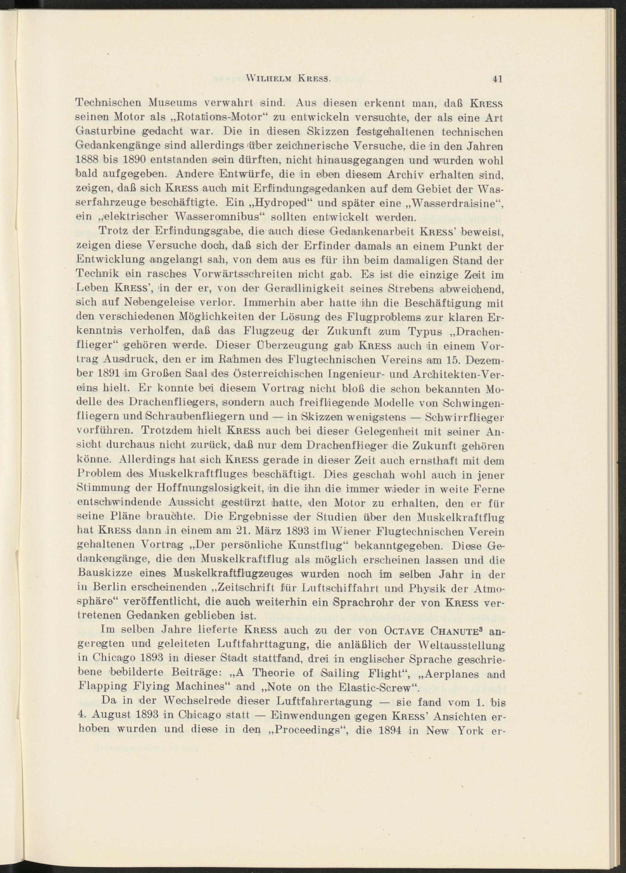 Da in der Wechselrede dieser Luftfahrertagung — sie fand vom 1. bis 4. August 1893 in Chicago statt — Einwendungen gegen Kress’ Ansichten erhoben wurden und diese in den „Proceedings“, die 1894 in New York er-
