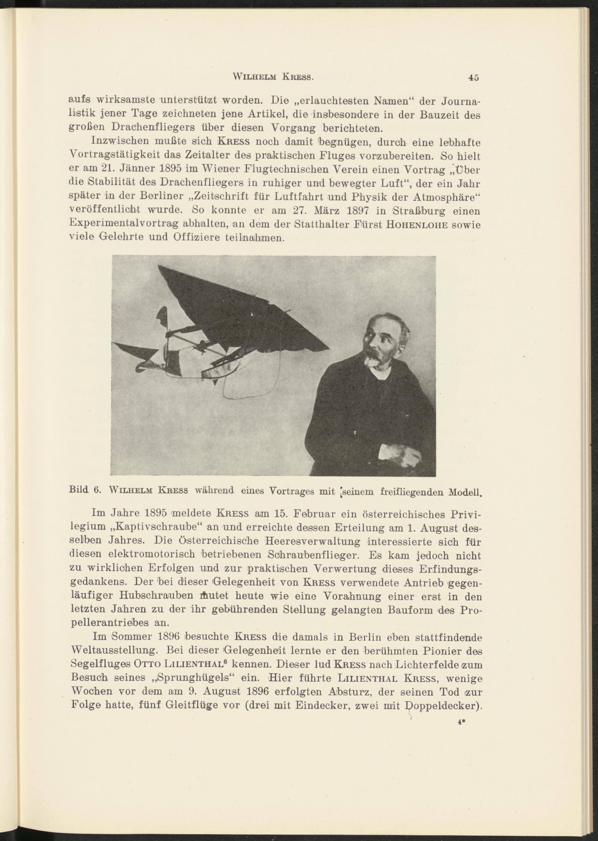 Im Sommer 1896 besuchte Kress die damals in Berlin eben stattfindende Weltausstellung. Bei dieser Gelegenheit lernte er den berühmten Pionier des Segelfluges Otto Lilienthal 6 kennen. Dieser lud Kress nach Lichterfelde zum Besuch seines „Sprunghügels“ ein. Hier führte Lilienthal Kress, wenige Wochen vor dem am 9. August 1896 erfolgten Absturz, der seinen Tod zur Folge hatte, fünf Gleitflüge vor (drei mit Eindecker, zwei mit Doppeldecker).