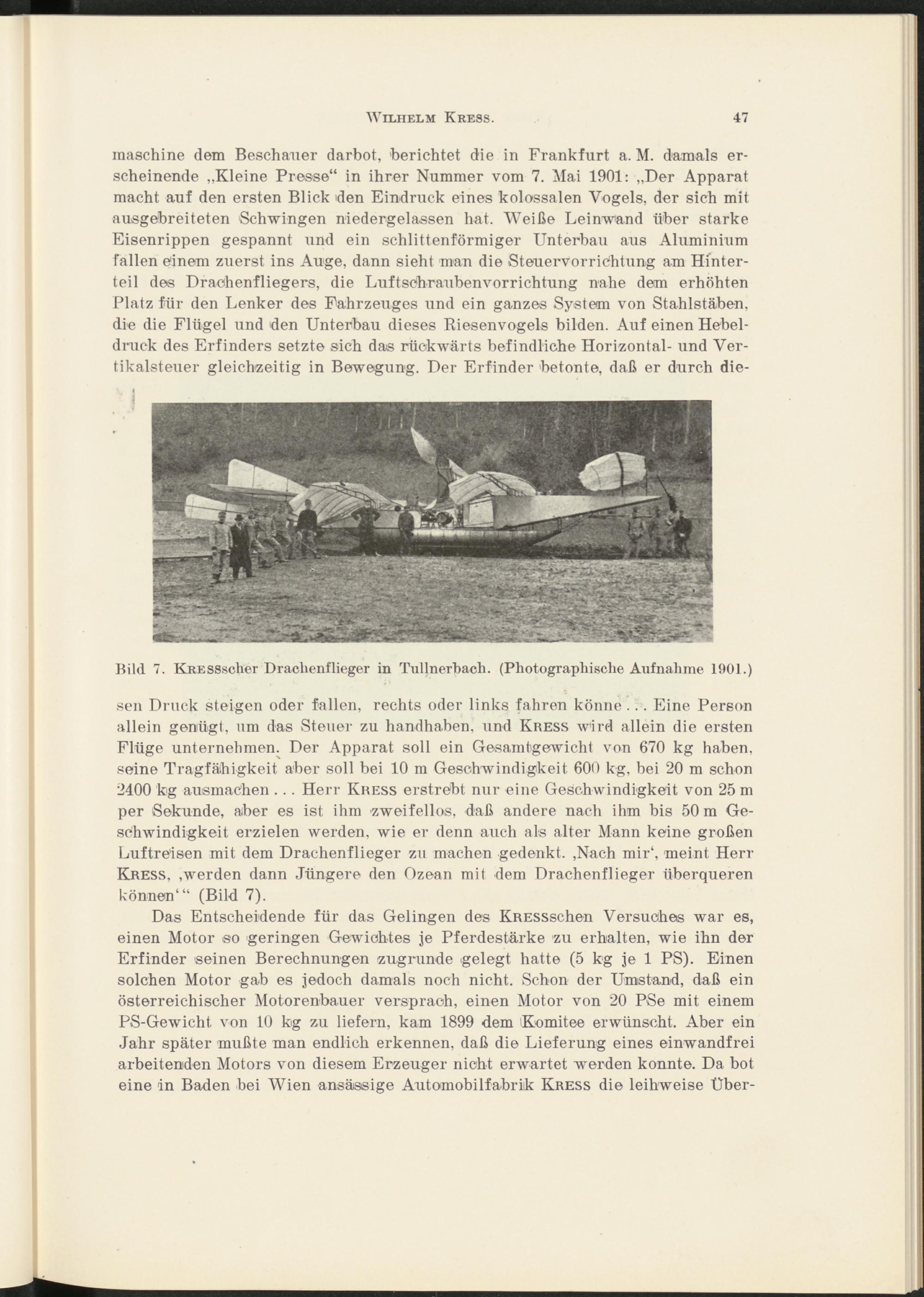 sen Druck steigen oder fallen, rechts oder links fahren könne ... Eine Person allein genügt, um das Steuer zu handhaben, und Kress wird allein die ersten Flüge Unternehmern Der Apparat soll ein Gesamtgewicht von 670 kg haben, seine Tragfähigkeit aber soll bei 10 m Geschwindigkeit 600 kg, bei 20 m schon 2400 kg ausmachen ... Herr Kress erstrebt nur eine Geschwindigkeit von 25 m per Sekunde, aber es ist ihm zweifellos, daß andere nach ihm bis 50 m Geschwindigkeit erzielen werden, wie er denn auch als alter Mann keine großen Luftreisen mit dem Drachenflieger zu machen gedenkt. ,Nach mir 1 , meint Herr Kress, ,werden dann Jüngere den Ozean mit dem Drachenflieger überqueren können 4 “ (Bild 7).
