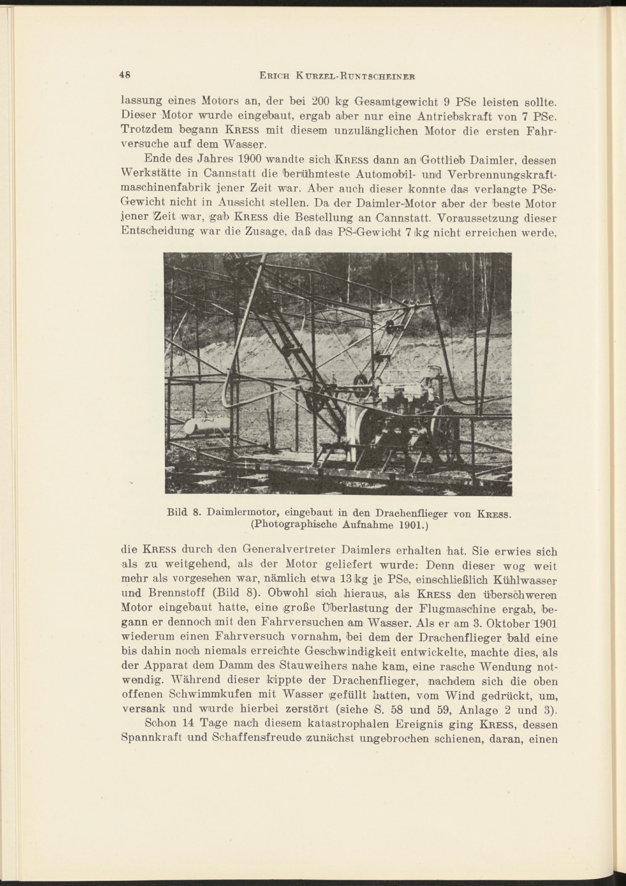 die Kress durch den Generalvertreter Daimlers erhalten hat. Sie erwies sich als zu weitgehend, als der Motor geliefert wurde: Denn dieser wog weit mehr als vorgesehen war, nämlich etwa 13 kg je PSe, einschließlich Kühlwasser und Brennstoff (Bild 8). Obwohl sich hieraus, als Kress den überschweren Motor eingebaut hatte, eine große Überlastung der Flugmaschine ergab, begann er dennoch mit den Fahrversuchen am Wasser. Als er am 3. Oktober 1901 wiederum einen Fahrversuch vornahm, bei dem der Drachenflieger bald eine bis dahin noch niemals erreichte Geschwindigkeit entwickelte, machte dies, als der Apparat dem Damm des Stauweihers nahe kam, eine rasche Wendung notwendig. Während dieser kippte der Drachenflieger, nachdem sich die oben offenen Schwimmkufen mit Wasser gefüllt hatten, vom Wind gedrückt, um, versank und wurde hierbei zerstört (siehe S. 58 und 59, Anlage 2 und 3).