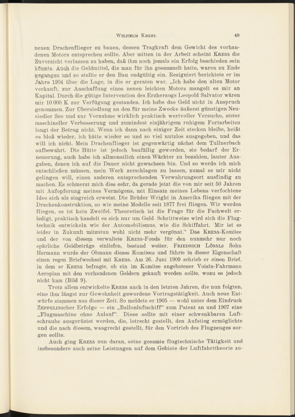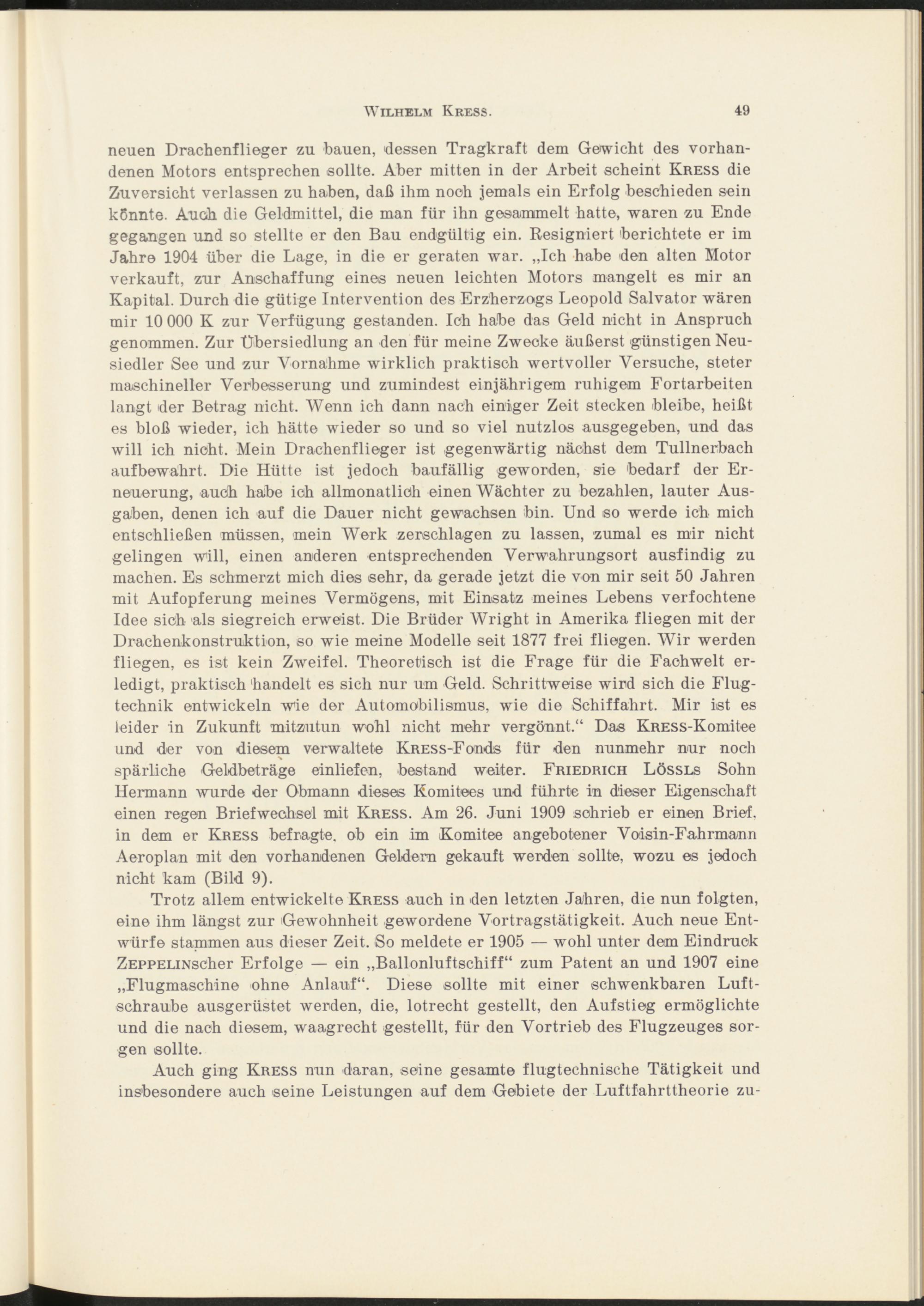 neuen Drachenflieger zu bauen, dessen Tragkraft dem Gewicht des vorhandenen Motors entsprechen sollte. Aber mitten in der Arbeit scheint Kress die Zuversicht verlassen zu haben, daß ihm noch jemals ein Erfolg beschieden sein könnte. Auch die Geldmittel, die man für ihn gesammelt hatte, waren zu Ende gegangen und so stellte er den Bau endgültig ein. Resigniert berichtete er im Jahre 1904 über die Lage, in die er geraten war. „Ich habe den alten Motor verkauft, zur Anschaffung eines neuen leichten Motors mangelt es mir an Kapital. Durch die gütige Intervention des Erzherzogs Leopold Salvator wären mir 10 000 K zur Verfügung gestanden. Ich habe das Geld nicht in Anspruch genommen. Zur Übersiedlung an den für meine Zwecke äußerst 'günstigen Neusiedler See und zur Vornahme wirklich praktisch wertvoller Versuche, steter maschineller Verbesserung und zumindest einjährigem ruhigem Fortarbeiten langt der Betrag nicht. Wenn ich dann nach einiger Zeit stecken bleibe, heißt es bloß wieder, ich hätte wieder so und so viel nutzlos ausgegeben, und das will ich nicht. Mein Drachenflieger ist gegenwärtig nächst dem Tullnerbach aufbewährt. Die Hütte ist jedoch baufällig geworden, sie bedarf der Erneuerung, auch habe ich allmonatlich einen Wächter zu bezahlen, lauter Ausgaben, denen ich auf die Dauer nicht gewachsen bin. Und so werde ich mich entschließen müssen, mein Werk zerschlagen zu lassen, zumal es mir nicht gelingen will, einen anderen entsprechenden Verwahrungsort ausfindig zu machen. Es schmerzt mich dies sehr, da gerade jetzt die von mir seit 50 Jahren mit Aufopferung meines Vermögens, mit Einsatz meines Lebens verfochtene Idee sich als siegreich erweist. Die Brüder Wright in Amerika fliegen mit der Drachenkonstruktion, so wie meine Modelle seit 1877 frei fliegen. Wir werden fliegen, es ist kein Zweifel. Theoretisch ist die Frage für die Fachwelt erledigt, praktisch handelt es sich nur um Geld. Schrittweise wird sich die Flugtechnik entwickeln wie der Automobilismus, wie die Schiffahrt. Mir ist es leider in Zukunft mitzutun wohl nicht mehr vergönnt.“ Das KRESS-Komitee und der von diesem verwaltete KRESS-Fonds für den nunmehr nur noch spärliche Geldbeträge einliefen, bestand weiter. Friedrich Lössls Sohn Hermann wurde der Obmann dieses Komitees und führte in dieser Eigenschaft einen regen Briefwechsel mit Kress. Am 26. Juni 1909 schrieb er einen Brief, in dem er Kress befragte, ob ein im Komitee angebotener Voisin-Fahrmann Aeroplan mit den vorhandenen Geldern gekauft werden sollte, wozu es jedoch nicht kam (Bild 9).