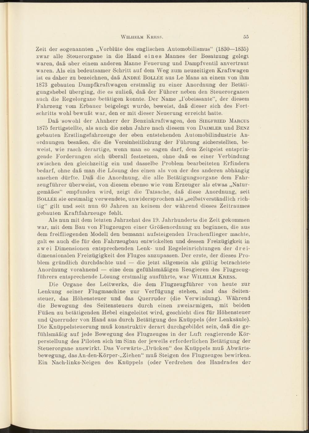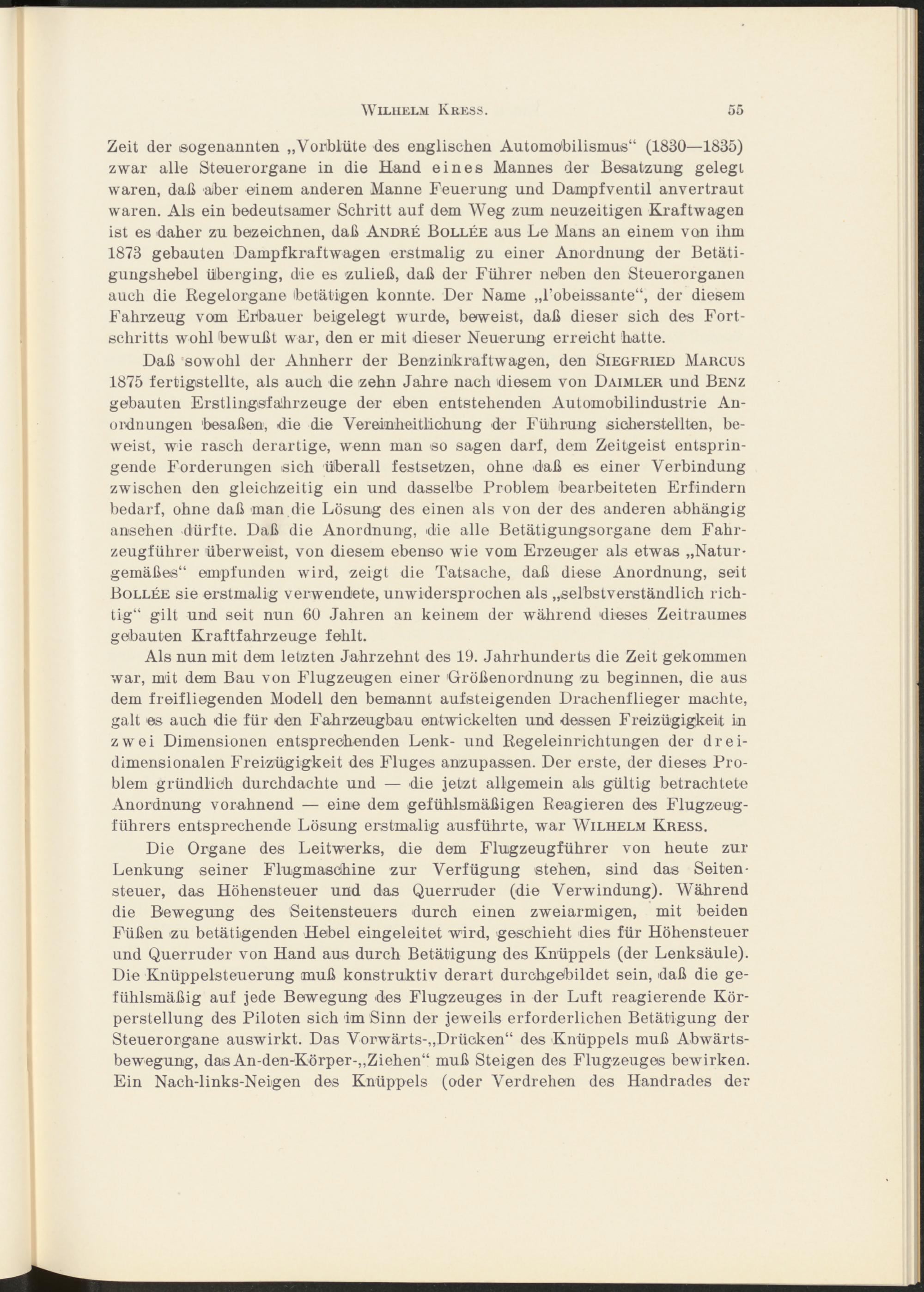 Als nun mit dem letzten Jahrzehnt des 19. Jahrhunderts die Zeit gekommen war, mit dem Bau von Flugzeugen einer Größenordnung zu beginnen, die aus dem freifliegenden Modell den bemannt aufsteigenden Drachenflieger machte, galt es auch die für den Fahrzeugbau entwickelten und dessen Freizügigkeit in zwei Dimensionen entsprechenden Lenk- und Regeleinrichtungen der dreidimensionalen Freizügigkeit des Fluges anzupassen. Der erste, der dieses Problem gründlich durchdachte und — die jetzt allgemein als gültig betrachtete Anordnung vorahnend — eine dem gefühlsmäßigen Reagieren des Flugzeugführers entsprechende Lösung erstmalig ausführte, war Wilhelm Kress.