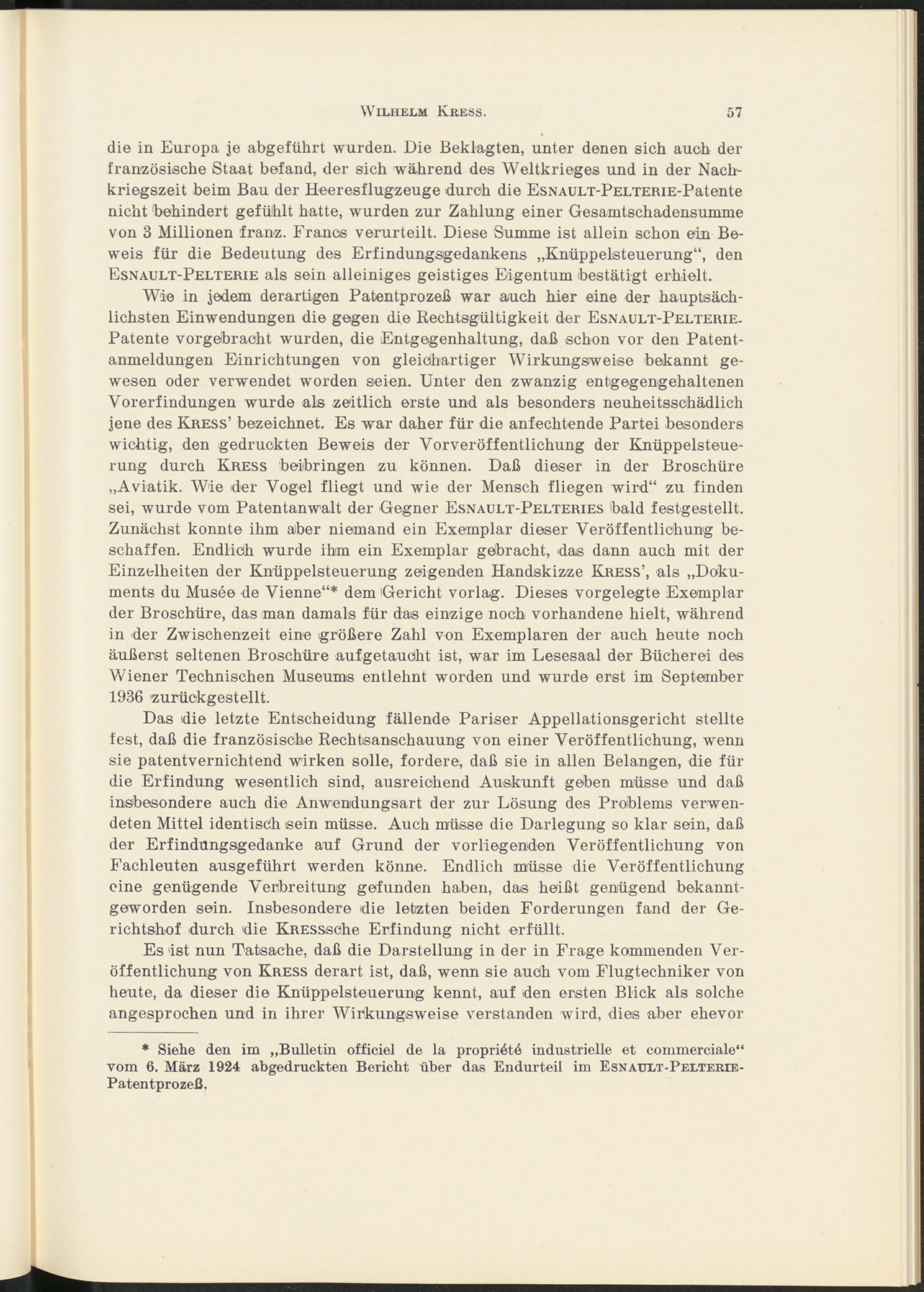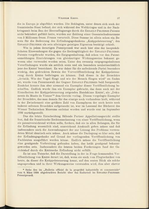 Wie in jedem derartigen Patentprozeß war auch hier eine der hauptsächlichsten Einwendungen die gegen die Rechtsgültigkeit der Esnault-Pelterie. Patente vorgebracht wurden, die Entgegenhaltung, daß schon vor den Patentanmeldungen Einrichtungen von gleichartiger Wirkungsweise bekannt gewesen oder verwendet worden seien. Unter den zwanzig entgegengehaltenen Vorerfindungen wurde als zeitlich erste und als besonders neuheitsschädlich jene des Kress’ bezeichnet. Es war daher für die anfechtende Partei besonders wichtig, den gedruckten Beweis der Vorveröffentlichung der Knüppelsteuerung durch Kress beibringen zu können. Daß dieser in der Broschüre „Aviatik. Wie der Vogel fliegt und wie der Mensch fliegen wird“ zu finden sei, wurde vom Patentanwalt der Gegner Esnault-Pelteries bald festgestellt. Zunächst konnte ihm aber niemand ein Exemplar dieser Veröffentlichung beschaffen. Endlich wurde ihm ein Exemplar gebracht, das dann auch mit der Einzelheiten der Knüppelsteuerung zeigenden Handskizze Kress’, als „Dokuments du Musee de Vienne“* dem Gericht vorlag. Dieses vorgelegte Exemplar der Broschüre, das man damals für das einzige noch vorhandene hielt, während in der Zwischenzeit eine größere Zahl von Exemplaren der auch heute noch äußerst seltenen Broschüre aufgetaucht ist, war im Lesesaal der Bücherei des Wiener Technischen Museums entlehnt worden und wurde erst im September 1936 'zurückgestellt.