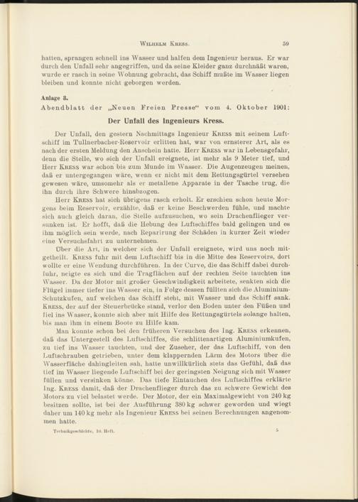 Der Unfall, den gestern Nachmittags Ingenieur Kress mit seinem Luftschiff im Tullnerbacher-Reservoir erlitten hat, war von ernsterer Art, als es nach der ersten Meldung den Anschein hatte. Herr Kress war in Lebensgefahr, denn die Stelle, wo sich der Unfall ereignete, ist mehr als 9 Meter tief, und Herr Kress war schon bis zum Munde im Wasser. Die Augenzeugen meinen, daß er untergegangen wäre, wenn er nicht mit dem Rettungsgürtel versehen gewesen wäre, umsomehr als er metallene Apparate in der Tasche trug, die ihn durch ihre Schwere hinabzogen.